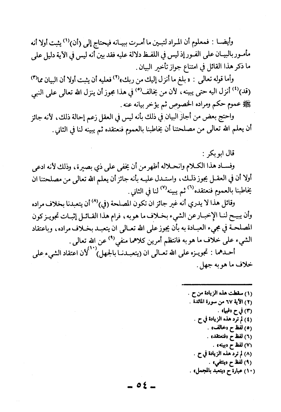 وَأَمَّا قَوْله تَعَالَى: {بَلِّغْ مَا أُنْزِلَ إلَيْك مِنْ رَبِّك} [المائدة: 67] فَعَلَيْهِ أَنْ يُثْبِتَ أَوَّلًا أَنَّ الْبَيَانَ مِمَّا (قَدْ) أُنْزِلَ إلَيْهِ حَتَّى يُبَيِّنَهُ، لِأَنَّ مَنْ يُخَالِفُ فِي هَذَا مُجَوِّزٌ أَنْ يُنَزِّلَ اللَّه تَعَالَى عَلَى النَّبِيِّ - صَلَّى اللَّهُ عَلَيْهِ وَسَلَّمَ - عُمُومَ حُكْمٍ وَمُرَادُهُ الْخُصُوصُ ثُمَّ يُؤَخِّرُ بَيَانَهُ عَنْهُ. وَاحْتَجَّ بَعْضُ مَنْ أَجَازَ الْبَيَانَ فِي ذَلِكَ بِأَنَّهُ لَيْسَ فِي الْعَقْلِ زَعْمُ إحَالَةِ ذَلِكَ، لِأَنَّهُ جَائِزٌ أَنْ يَعْلَمَ اللَّهُ تَعَالَى مِنْ مَصْلَحَتِنَا أَنْ يُخَاطِبَنَا بِالْعُمُومِ فَنَعْتَقِدُهُ ثُمَّ يُبَيِّنُهُ لَنَا فِي الثَّانِي.