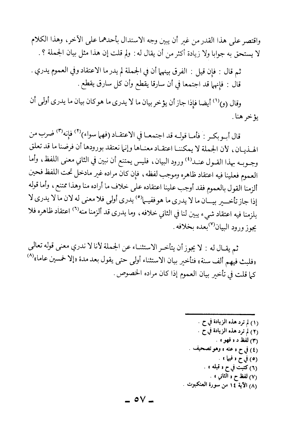 وَهَذَا الْكَلَامُ لَا يَسْتَحِقُّ بِهِ جَوَابًا وَلَا زِيَادَةً أَكْثَرَ مِنْ أَنْ يُقَالَ لَهُ: وَلِمَ قُلْت إنَّ هَذَا مِثْلُ بَيَانِ الْجُمْلَةِ؟ . ثُمَّ قَالَ: فَإِنْ قِيلَ: الْفَرْقُ بَيْنَهُمَا أَنَّ فِي الْجُمْلَةِ لَمْ يَدْرِ مَا الِاعْتِقَادُ وَفِي الْعُمُومِ يَدْرِي. قَالَ: فَإِنَّهُمَا قَدْ اجْتَمَعَا فِي أَنَّ سَارِقًا يُقْطَعُ وَأَنَّ كُلَّ سَارِقٍ يُقْطَعُ.