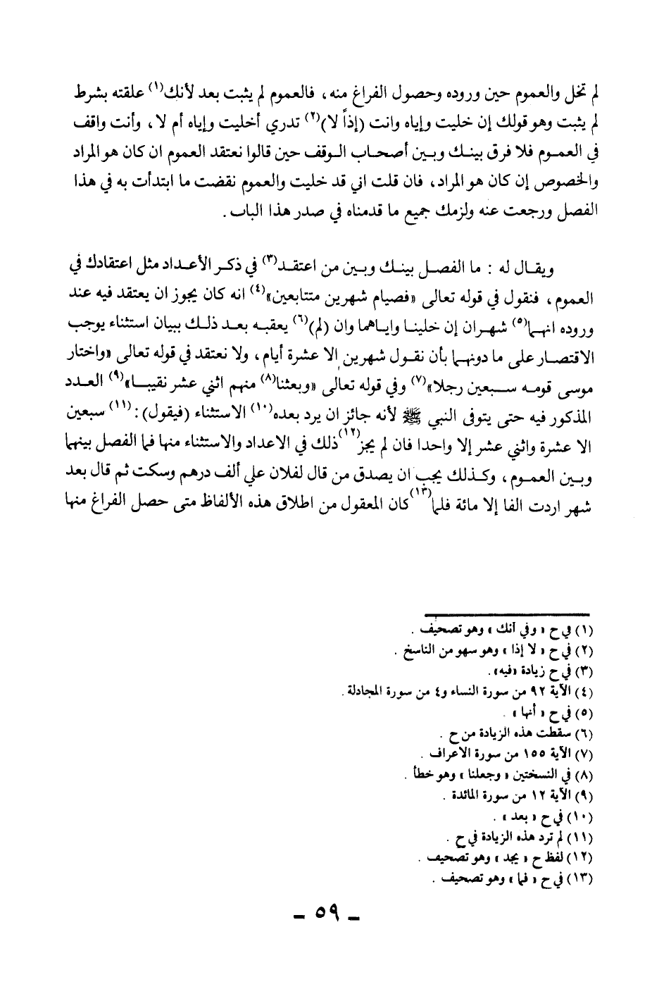 لَمْ تُخَلَّ وَالْعُمُومَ حِينَ وُرُودِهِ وَحُصُولِ الْفَرَاغِ مِنْهُ، فَالْعُمُومُ لَمْ يَثْبُتْ بَعْدُ لِأَنَّك عَلَّقْته بِشَرْطٍ لَمْ يَثْبُتْ وَهُوَ قَوْلُك إنْ خُلِّيت وَإِيَّاهُ وَأَنْتَ (إذَا لَا) تَدْرِي أَخُلِّيت وَإِيَّاهُ أَمْ لَا، وَأَنْتَ وَاقِفٌ فِي الْعُمُومِ فَلَا فَرْقَ بَيْنَك وَبَيْنَ أَصْحَابِ الْوَقْفِ حِينَ قَالُوا نَعْتَقِدُ الْعُمُومَ إنْ كَانَ هُوَ الْمُرَادَ وَالْخُصُوصَ إنْ كَانَ هُوَ الْمُرَادَ، فَإِنْ قُلْت إنِّي قَدْ خُلِّيت وَالْعُمُومَ نَقَضْت مَا ابْتَدَأْت بِهِ فِي هَذَا الْفَصْلِ وَرَجَعْت عَنْهُ وَلَزِمَك جَمِيعُ مَا قَدَّمْنَاهُ فِي صَدْرِ هَذَا الْبَابِ.