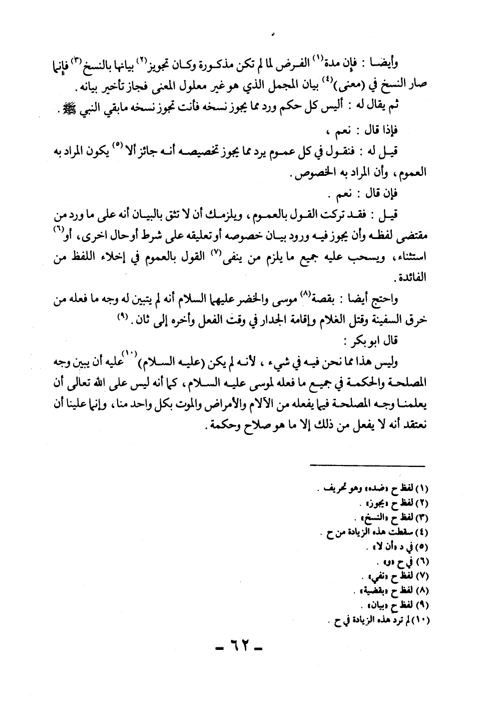 وَأَيْضًا: فَإِنَّ مُدَّةَ الْفَرْضِ لَمَّا لَمْ تَكُنْ مَذْكُورَةً وَكَانَ تَجْوِيزُ بَيَانِهَا بِالنَّسْخِ فَإِنَّمَا صَارَ النَّسْخُ فِي (مَعْنَى) بَيَانِ الْمُجْمَلِ الَّذِي هُوَ غَيْرُ مَعْلُولِ الْمَعْنَى فَجَازَ تَأْخِيرُ بَيَانِهِ. ثُمَّ يُقَالُ لَهُ: أَلَيْسَ كُلُّ حُكْمٍ وَرَدَ مِمَّا يَجُوزُ نَسْخُهُ فَأَنْتَ تُجَوِّزُ نَسْخَهُ مَا بَقِيَ النَّبِيُّ - صَلَّى اللَّهُ عَلَيْهِ وَسَلَّمَ -. فَإِذَا قَالَ: نَعَمْ، قِيلَ لَهُ: فَنَقُولُ فِي كُلِّ عُمُومٍ يَرِدُ مِمَّا يَجُوزُ تَخْصِيصُهُ أَنَّهُ جَائِزٌ أَلَا يَكُونُ الْمُرَادُ بِهِ الْعُمُومَ، وَأَنَّ الْمُرَادَ بِهِ الْخُصُوصُ. فَإِنْ قَالَ: نَعَمْ. قِيلَ: فَقَدْ تَرَكْت الْقَوْلَ بِالْعُمُومِ، وَيَلْزَمُك أَنْ لَا تَثِقَ بِالْبَيَانِ أَنَّهُ عَلَى مَا وَرَدَ مِنْ مُقْتَضَى لَفْظِهِ وَأَنْ يَجُوزَ فِيهِ وُرُودُ بَيَانِ خُصُوصِهِ أَوْ تَعْلِيقِهِ عَلَى شَرْطٍ أَوْ حَالٍ أُخْرَى، أَوْ اسْتِثْنَاءٍ، وَيُسْحَبُ عَلَيْهِ جَمِيعُ مَا يَلْزَمُ مَنْ يَنْفِي الْقَوْلَ بِالْعُمُومِ فِي إخْلَاءِ اللَّفْظِ مِنْ الْفَائِدَةِ. وَاحْتَجَّ أَيْضًا: بِقِصَّةِ مُوسَى وَالْخَضِرِ - عَلَيْهِمَا السَّلَامُ - أَنَّهُ لَمْ يَتَبَيَّنْ لَهُ وَجْهُ مَا فَعَلَهُ مِنْ خَرْقِ السَّفِينَةِ وَقَتْلِ الْغُلَامِ وَإِقَامَةِ الْجِدَارِ فِي وَقْتِ الْفِعْلِ وَأَخَّرَهُ إلَى ثَانٍ. قَالَ أَبُو بَكْرٍ: وَلَيْسَ هَذَا مِمَّا نَحْنُ فِيهِ فِي شَيْءٍ، لِأَنَّهُ لَمْ يَكُنْ - عَلَيْهِ السَّلَامُ - عَلَيْهِ أَنْ يُبَيِّنَ وَجْهَ الْمَصْلَحَةِ وَالْحِكْمَةِ فِي جَمِيعِ مَا فَعَلَهُ لِمُوسَى - عَلَيْهِ السَّلَامُ -، كَمَا أَنَّهُ لَيْسَ عَلَى اللَّهِ تَعَالَى أَنْ يُعَلِّمَنَا وَجْهَ الْمَصْلَحَةِ فِيمَا يَفْعَلُهُ مِنْ الْآلَامِ وَالْأَمْرَاضِ وَالْمَوْتِ بِكُلِّ وَاحِدٍ مِنَّا، وَإِنَّمَا عَلَيْنَا أَنْ نَعْتَقِدَ أَنَّهُ لَا يَفْعَل مِنْ ذَلِكَ إلَّا مَا هُوَ صَلَاحٌ وَحِكْمَةٌ.