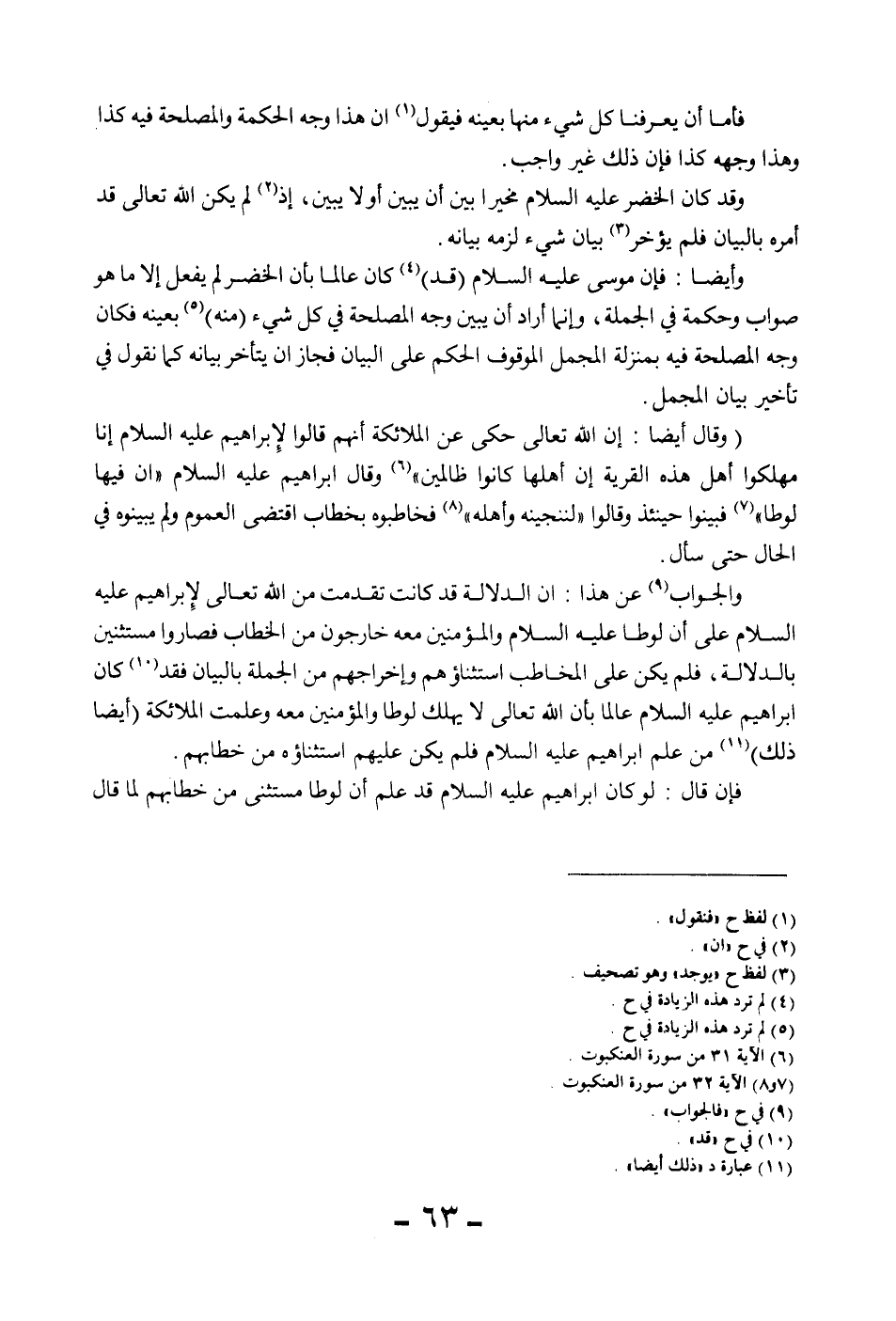 وَأَيْضًا: فَإِنَّ مُوسَى - عَلَيْهِ السَّلَامُ - (قَدْ) كَانَ عَالِمًا بِأَنَّ الْخَضِرَ لَمْ يَفْعَلْ إلَّا مَا هُوَ صَوَابٌ وَحِكْمَةٌ فِي الْجُمْلَةِ، وَإِنَّمَا أَرَادَ أَنْ يُبَيِّنَ وَجْهَ الْمَصْلَحَةِ فِي كُلِّ شَيْءٍ (مِنْهُ) بِعَيْنِهِ فَكَانَ وَجْهُ الْمَصْلَحَةِ فِيهِ بِمَنْزِلَةِ الْمُجْمَلِ الْمَوْقُوفِ الْحُكْمُ عَلَى الْبَيَانِ فَجَازَ أَنْ يَتَأَخَّرَ بَيَانُهُ كَمَا نَقُولُ فِي تَأْخِيرِ بَيَانِ الْمُجْمَلِ. (وَقَالَ أَيْضًا: إنَّ اللَّهَ تَعَالَى حَكَى عَنْ الْمَلَائِكَةِ أَنَّهُمْ قَالُوا لِإِبْرَاهِيمَ - عَلَيْهِ السَّلَامُ - {إنَّا مُهْلِكُو أَهْلِ هَذِهِ الْقَرْيَةِ إنَّ أَهْلَهَا كَانُوا ظَالِمِينَ} [العنكبوت: 31] وَقَالَ إبْرَاهِيمُ - عَلَيْهِ السَّلَامُ - {إنَّ فِيهَا لُوطًا} [العنكبوت: 32] فَبَيَّنُوا حِينَئِذٍ وَقَالُوا {لَنُنَجِّيَنَّهُ وَأَهْلَهُ} [العنكبوت: 32] فَخَاطَبُوهُ بِخِطَابٍ اقْتَضَى الْعُمُومَ وَلَمْ يُبَيِّنُوهُ فِي الْحَالِ حَتَّى سَأَلَ) . وَالْجَوَابُ عَنْ هَذَا: أَنَّ الدَّلَالَةَ قَدْ كَانَتْ تَقَدَّمَتْ مِنْ اللَّهِ تَعَالَى لِإِبْرَاهِيمَ - عَلَيْهِ السَّلَامُ - عَلَى أَنَّ لُوطًا - عَلَيْهِ السَّلَامُ - وَالْمُؤْمِنِينَ مَعَهُ خَارِجُونَ مِنْ الْخِطَابِ فَصَارُوا مُسْتَثْنِينَ بِالدَّلَالَةِ، فَلَمْ يَكُنْ عَلَى الْمُخَاطِبِ اسْتِثْنَاؤُهُمْ وَإِخْرَاجُهُمْ مِنْ الْجُمْلَةِ بِالْبَيَانِ فَقَدْ كَانَ إبْرَاهِيمُ - عَلَيْهِ السَّلَامُ - عَالِمًا بِأَنَّ اللَّهَ تَعَالَى لَا يُهْلِكُ لُوطًا وَالْمُؤْمِنِينَ مَعَهُ وَعَلِمَتْ الْمَلَائِكَةُ (أَيْضًا ذَلِكَ) مِنْ عِلْمِ إبْرَاهِيمَ - عَلَيْهِ السَّلَامُ - فَلَمْ يَكُنْ عَلَيْهِمْ اسْتِثْنَاؤُهُ مِنْ خِطَابِهِمْ.