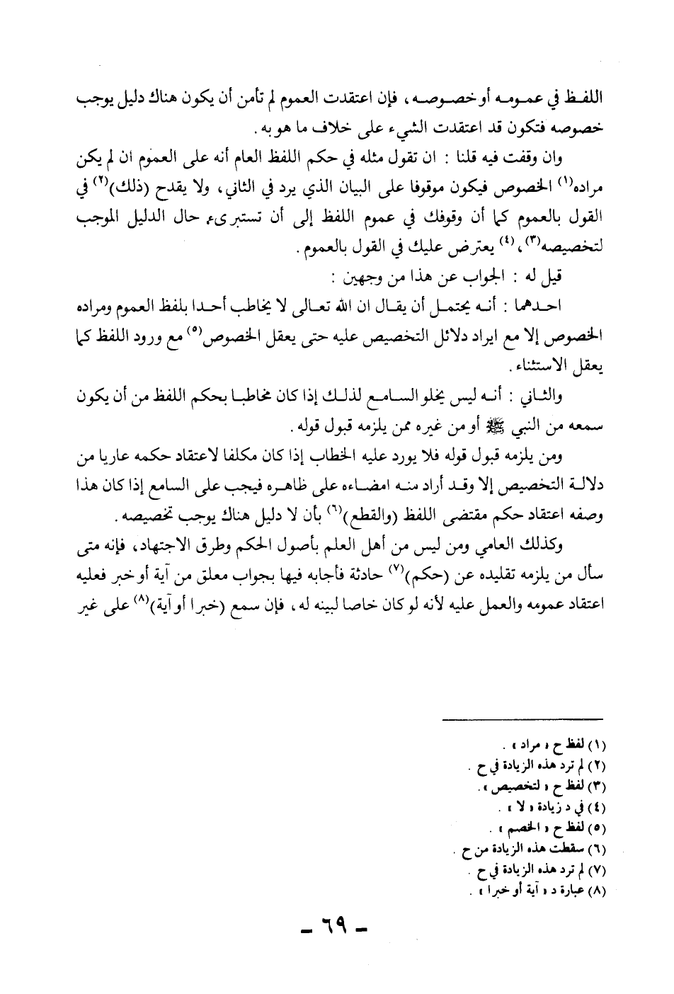 اللَّفْظِ فِي عُمُومِهِ أَوْ خُصُوصِهِ، فَإِنْ اعْتَقَدْت الْعُمُومَ لَمْ تَأْمَنْ أَنْ يَكُونَ هُنَاكَ دَلِيلٌ يُوجِبُ خُصُوصَهُ فَتَكُونُ قَدْ اعْتَقَدْت الشَّيْءَ عَلَى خِلَافِ مَا هُوَ بِهِ.