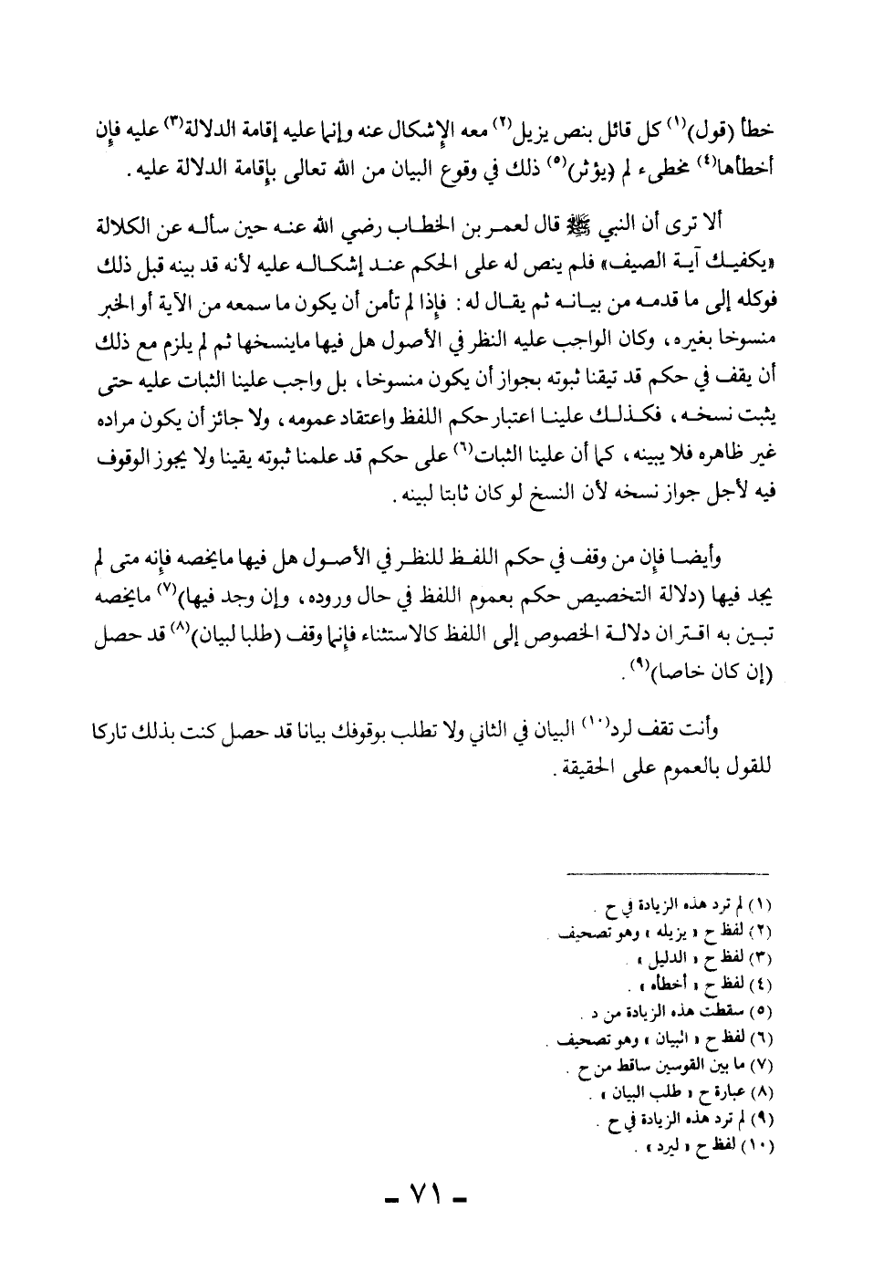 أَلَا تَرَى «أَنَّ النَّبِيَّ - صَلَّى اللَّهُ عَلَيْهِ وَسَلَّمَ - قَالَ لِعُمَرَ بْنِ الْخَطَّابِ - رَضِيَ اللَّهُ عَنْهُ - حِينَ سَأَلَهُ عَنْ الْكَلَالَةِ يَكْفِيك آيَةُ الصَّيْفِ» فَلَمْ يَنُصَّ لَهُ عَلَى الْحُكْمِ عِنْدَ إشْكَالِهِ عَلَيْهِ لِأَنَّهُ قَدْ بَيَّنَهُ قَبْلَ ذَلِكَ فَوَكَلَهُ إلَى مَا قَدَّمَهُ مِنْ بَيَانِهِ ثُمَّ يُقَالُ لَهُ: فَإِذَا لَمْ تَأْمَنْ أَنْ يَكُونَ مَا سَمِعَهُ مِنْ الْآيَةِ أَوْ الْخَبَرِ مَنْسُوخًا بِغَيْرِهِ، وَكَانَ الْوَاجِبُ عَلَيْهِ النَّظَرَ فِي الْأُصُولِ هَلْ فِيهَا مَا يَنْسَخُهَا ثُمَّ لَمْ يَلْزَمْ مَعَ ذَلِكَ أَنْ يَقِفَ فِي حُكْمٍ قَدْ تَيَقَّنَّا ثُبُوتَهُ بِجَوَازِ أَنْ يَكُونَ مَنْسُوخًا، بَلْ وَاجِبٌ عَلَيْنَا الثَّبَاتُ عَلَيْهِ حَتَّى يَثْبُتَ نَسْخُهُ، فَكَذَلِكَ عَلَيْنَا اعْتِبَارُ حُكْمِ اللَّفْظِ وَاعْتِقَادُ عُمُومِهِ، وَلَا جَائِزٌ أَنْ يَكُونَ مُرَادُهُ غَيْرَ ظَاهِرِهِ فَلَا يُبَيِّنُهُ، كَمَا أَنَّ عَلَيْنَا الثَّبَاتَ عَلَى حُكْمٍ قَدْ عَلِمْنَا ثُبُوتَهُ يَقِينًا وَلَا يَجُوزُ الْوُقُوفُ فِيهِ لِأَجْلِ جَوَازِ نَسْخِهِ لِأَنَّ النَّسْخَ لَوْ كَانَ ثَابِتًا لَبَيَّنَهُ.