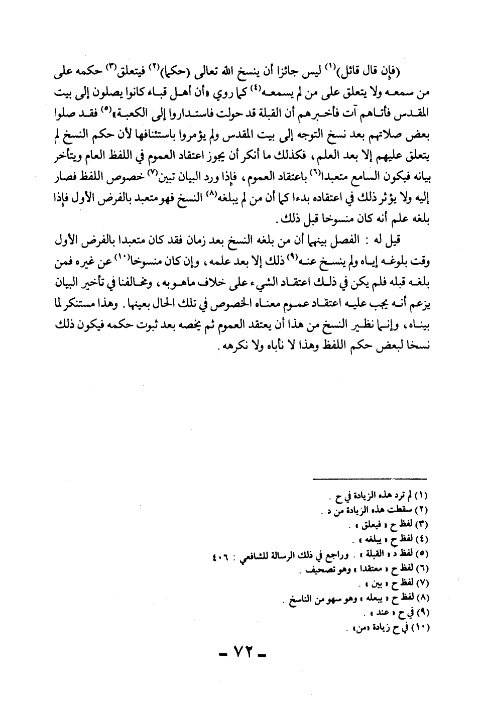 (فَإِنْ قَالَ قَائِلٌ) لَيْسَ جَائِزًا أَنْ يَنْسَخَ اللَّهُ تَعَالَى (حُكْمًا) فَيَتَعَلَّقَ حُكْمُهُ عَلَى مَنْ سَمِعَهُ وَلَا يَتَعَلَّقُ عَلَى مَنْ لَمْ يَسْمَعْهُ كَمَا رُوِيَ «أَنَّ أَهْلَ قُبَاءَ كَانُوا يُصَلُّونَ إلَى بَيْتِ الْمَقْدِسِ فَأَتَاهُمْ آتٍ فَأَخْبَرَهُمْ أَنَّ الْقِبْلَةَ قَدْ حُوِّلَتْ فَاسْتَدَارُوا إلَى الْكَعْبَةِ» فَقَدْ صَلَّوْا بَعْضَ صَلَاتِهِمْ بَعْدَ نَسْخِ التَّوَجُّهِ إلَى بَيْتِ الْمَقْدِسِ وَلَمْ يُؤْمَرُوا بِاسْتِئْنَافِهَا لِأَنَّ حُكْمَ النَّسْخِ لَمْ يَتَعَلَّقْ عَلَيْهِمْ إلَّا بَعْدَ الْعِلْمِ، فَكَذَلِكَ مَا أُنْكِرَ أَنْ يَجُوزَ اعْتِقَادُ الْعُمُومِ فِي اللَّفْظِ الْعَامِّ وَيَتَأَخَّرَ بَيَانُهُ فَيَكُونُ السَّامِعُ مُتَعَبِّدًا بِاعْتِقَادِ الْعُمُومِ، فَإِذَا وَرَدَ الْبَيَانُ تَبَيَّنَ خُصُوصُ اللَّفْظِ فَصَارَ إلَيْهِ وَلَا يُؤَثِّرُ ذَلِكَ فِي اعْتِقَادِهِ بَدْءًا كَمَا أَنَّ مَنْ لَمْ يَبْلُغْهُ النَّسْخُ فَهُوَ مُتَعَبِّدٌ بِالْفَرْضِ الْأَوَّلِ فَإِذَا بَلَغَهُ عِلْمُ أَنَّهُ كَانَ مَنْسُوخًا قَبْلَ ذَلِكَ. قِيلَ لَهُ: الْفَصْلُ بَيْنَهُمَا أَنَّ مَنْ بَلَغَهُ النَّسْخُ بَعْدَ زَمَانٍ فَقَدْ كَانَ مُتَعَبِّدًا بِالْفَرْضِ الْأَوَّلِ وَقْتَ بُلُوغِهِ إيَّاهُ وَلَمْ يُنْسَخْ عَنْهُ ذَلِكَ إلَّا بَعْدَ عِلْمِهِ، وَإِنْ كَانَ مَنْسُوخًا عَنْ غَيْرِهِ فَمَنْ بَلَغَهُ قَبْلَهُ فَلَمْ يَكُنْ فِي ذَلِكَ اعْتِقَادُ الشَّيْءِ عَلَى خِلَافِ مَا هُوَ بِهِ، وَمُخَالِفُنَا فِي تَأْخِيرِ الْبَيَانِ يَزْعُمُ أَنَّهُ يَجِبُ عَلَيْهِ اعْتِقَادُ عُمُومٍ، مَعْنَاهُ الْخُصُوصُ فِي تِلْكَ الْحَالِ بِعَيْنِهَا.