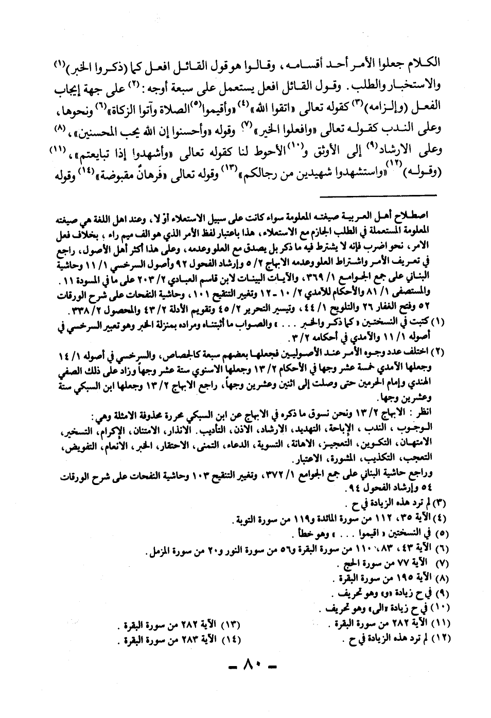 الْكَلَامَ جَعَلُوا الْأَمْرَ أَحَدَ أَقْسَامِهِ، وَقَالُوا هُوَ قَوْلُ الْقَائِلِ افْعَلْ كَمَا (ذَكَرُوا الْخَبَرَ) وَالِاسْتِخْبَارَ وَالطَّلَبَ. وَقَوْلُ الْقَائِلِ افْعَلْ يُسْتَعْمَلُ عَلَى سَبْعَةِ أَوْجُهٍ: عَلَى جِهَةِ إيجَابِ الْفِعْلِ (وَإِلْزَامِهِ) كَقَوْلِهِ تَعَالَى {واتَّقُوا اللَّهَ} [البقرة: 189] {وَأَقِيمُوا الصَّلَاةَ وَآتُوا الزَّكَاةَ} [البقرة: 43] وَنَحْوِهَا، وَعَلَى النَّدْبِ كَقَوْلِهِ تَعَالَى {وَافْعَلُوا الْخَيْرَ} [الحج: 77] وَقَوْلِهِ {وَأَحْسِنُوا إنَّ اللَّهَ يُحِبُّ الْمُحْسِنِينَ} [البقرة: 195] ، وَعَلَى الْإِرْشَادِ إلَى الْأَوْثَقِ وَالْأَحْوَطِ لَنَا كَقَوْلِهِ تَعَالَى {وَأَشْهِدُوا إذَا تَبَايَعْتُمْ} [البقرة: 282] ، (وَقَوْلِهِ) {وَاسْتَشْهِدُوا شَهِيدَيْنِ مِنْ رِجَالِكُمْ} [البقرة: 282] وقَوْله تَعَالَى {فَرِهَانٌ مَقْبُوضَةٌ} [البقرة: 283] وقَوْله تَعَالَى