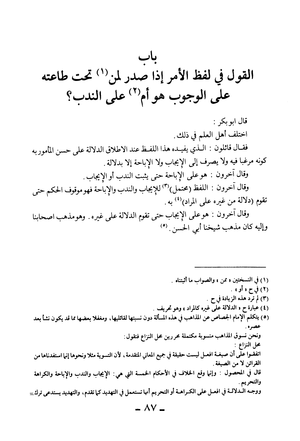 وَقَالَ آخَرُونَ: هُوَ عَلَى الْإِبَاحَةِ حَتَّى يَثْبُتَ النَّدْبُ أَوْ الْإِيجَابُ. وَقَالَ آخَرُونَ: اللَّفْظُ (مُحْتَمِلٌ) لِلْإِيجَابِ وَالنَّدْبِ وَالْإِبَاحَةِ فَهُوَ مَوْقُوفُ الْحُكْمِ حَتَّى تَقُومَ (دَلَالَةٌ مِنْ غَيْرِهِ عَلَى الْمُرَادِ) بِهِ. وَقَالَ آخَرُونَ: هُوَ عَلَى الْإِيجَابِ حَتَّى تَقُومَ الدَّلَالَةُ عَلَى غَيْرِهِ. وَهُوَ مَذْهَبُ أَصْحَابِنَا وَإِلَيْهِ كَانَ مَذْهَبُ شَيْخِنَا أَبِي الْحَسَنِ.