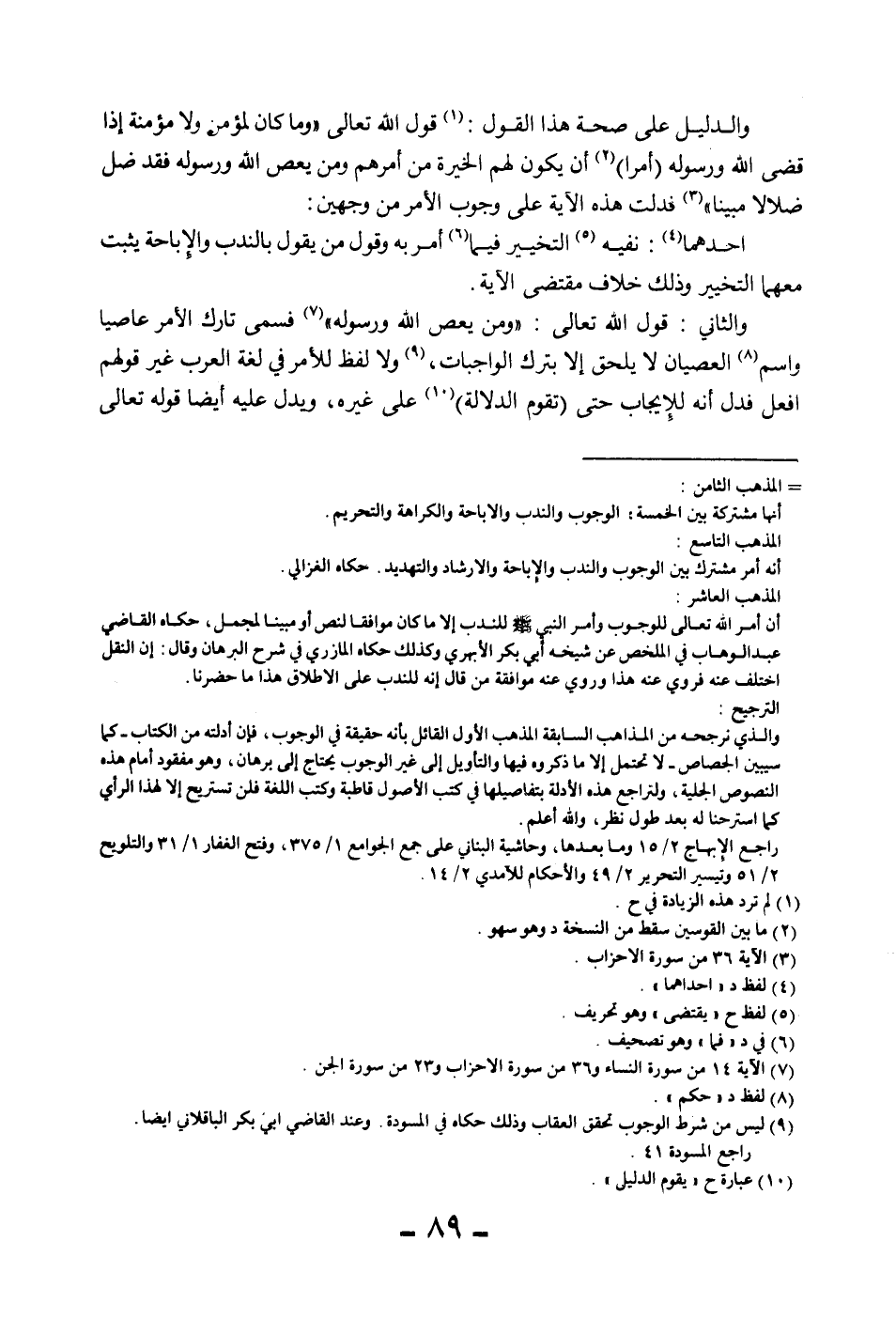 وَالدَّلِيلُ عَلَى صِحَّةِ هَذَا الْقَوْلِ: قَوْلُ اللَّهِ تَعَالَى {وَمَا كَانَ لِمُؤْمِنٍ وَلَا مُؤْمِنَةٍ إذَا قَضَى اللَّهُ وَرَسُولُهُ أَمْرًا أَنْ يَكُونَ لَهُمْ الْخِيَرَةُ مِنْ أَمْرِهِمْ وَمَنْ يَعْصِ اللَّهَ وَرَسُولَهُ فَقَدْ ضَلَّ ضَلَالًا مُبِينًا} [الأحزاب: 36] فَدَلَّتْ هَذِهِ الْآيَةُ عَلَى وُجُوبِ الْأَمْرِ مِنْ وَجْهَيْنِ: أَحَدُهُمَا: نَفْيُهُ التَّخْيِيرَ فِيمَا أَمَرَ بِهِ وَقَوْلُ مَنْ يَقُولُ بِالنَّدْبِ وَالْإِبَاحَةِ يُثْبِتُ مَعَهُمَا التَّخْيِيرَ وَذَلِكَ خِلَافُ مُقْتَضَى الْآيَةِ.
