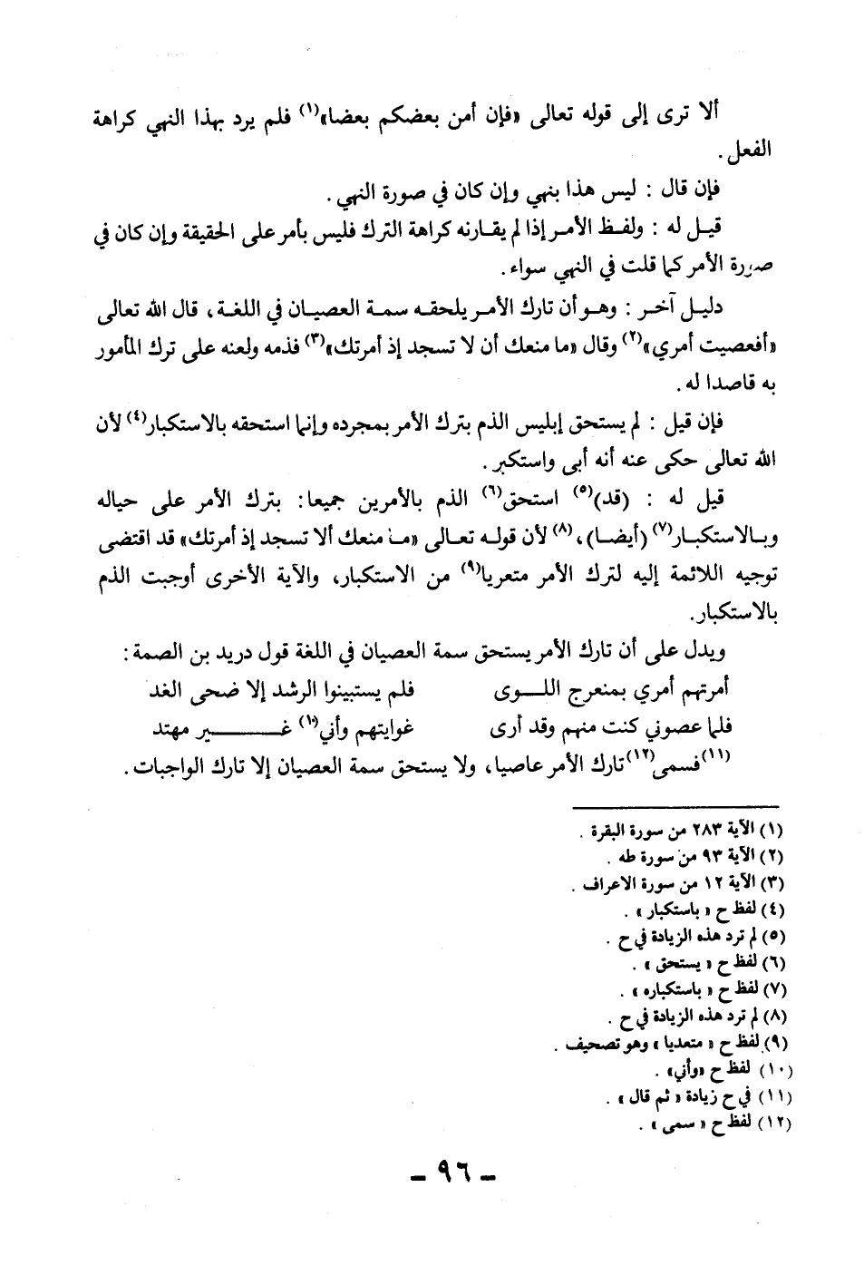 فَإِنْ قِيلَ: لَمْ يَسْتَحِقَّ إبْلِيسُ الذَّمَّ بِتَرْكِ الْأَمْرِ بِمُجَرَّدِهِ وَإِنَّمَا اسْتَحَقَّهُ بِالِاسْتِكْبَارِ لِأَنَّ اللَّهَ تَعَالَى حَكَى عَنْهُ أَنَّهُ أَبَى وَاسْتَكْبَرَ. قِيلَ لَهُ: (قَدْ) اسْتَحَقَّ الذَّمَّ بِالْأَمْرَيْنِ جَمِيعًا: بِتَرْكِ الْأَمْرِ عَلَى حِيَالِهِ وَبِالِاسْتِكْبَارِ (أَيْضًا) ، لِأَنَّ قَوْله تَعَالَى {مَا مَنَعَك أَلَّا تَسْجُدَ إذْ أَمَرْتُك} [الأعراف: 12] قَدْ اقْتَضَى تَوْجِيهَ اللَّائِمَةِ إلَيْهِ لِتَرْكِ الْأَمْرِ مُتَعَرِّيًا مِنْ الِاسْتِكْبَارِ، وَالْآيَةُ الْأُخْرَى أَوْجَبَتْ الذَّمَّ بِالِاسْتِكْبَارِ. وَيَدُلُّ عَلَى أَنَّ تَارِكَ الْأَمْرِ يَسْتَحِقُّ سِمَةَ الْعِصْيَانِ فِي اللُّغَةِ قَوْلُ دُرَيْدِ بْنِ الصِّمَّةِ: