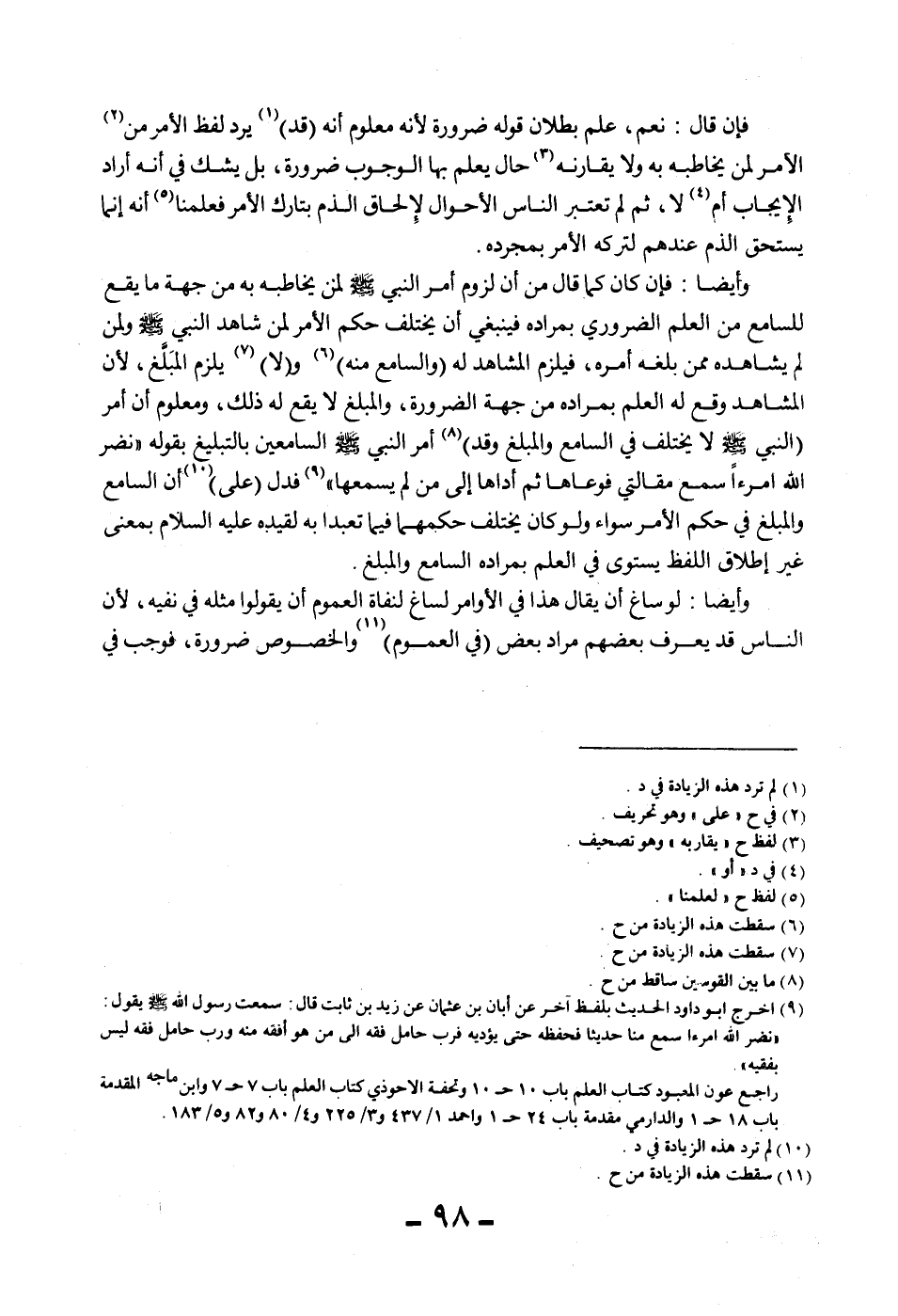 وَأَيْضًا: فَإِنْ كَانَ كَمَا قَالَ مِنْ أَنَّ لُزُومَ أَمْرِ النَّبِيِّ - صَلَّى اللَّهُ عَلَيْهِ وَسَلَّمَ - لِمَنْ يُخَاطِبُهُ بِهِ مِنْ جِهَةِ مَا يَقَعُ لِلسَّامِعِ مِنْ الْعِلْمِ الضَّرُورِيِّ بِمُرَادِهِ فَيَنْبَغِي أَنْ يَخْتَلِفَ حُكْمُ الْأَمْرِ لِمَنْ شَاهَدَ النَّبِيَّ - صَلَّى اللَّهُ عَلَيْهِ وَسَلَّمَ - وَلِمَنْ لَمْ يُشَاهِدْهُ مِمَّنْ بَلَغَهُ أَمْرُهُ، فَيَلْزَمُ الْمُشَاهِدَ لَهُ (وَالسَّامِعَ مِنْهُ) وَ (لَا) يَلْزَمُ الْمُبَلِّغَ، لِأَنَّ الْمُشَاهِدَ وَقَعَ لَهُ الْعِلْمُ بِمُرَادِهِ مِنْ جِهَةِ الضَّرُورَةِ، وَالْمُبَلِّغَ لَا يَقَعُ لَهُ ذَلِكَ، وَمَعْلُومٌ أَنَّ أَمْرَ (النَّبِيِّ - صَلَّى اللَّهُ عَلَيْهِ وَسَلَّمَ - لَا يَخْتَلِفُ فِي السَّامِعِ وَالْمُبَلِّغِ وَقَدْ) أَمَرَ النَّبِيُّ - صَلَّى اللَّهُ عَلَيْهِ وَسَلَّمَ - السَّامِعِينَ بِالتَّبْلِيغِ بِقَوْلِهِ «نَضَّرَ اللَّهُ امْرَأً سَمِعَ مَقَالَتِي فَوَعَاهَا ثُمَّ أَدَّاهَا إلَى مَنْ لَمْ يَسْمَعْهَا» فَدَلَّ (عَلَى) أَنَّ السَّامِعَ وَالْمُبَلِّغَ فِي حُكْمِ الْأَمْرِ سَوَاءٌ وَلَوْ كَانَ يَخْتَلِفُ حُكْمُهُمَا فِيمَا تَعَبَّدَا بِهِ لِقَيْدِهِ - عَلَيْهِ السَّلَامُ - بِمَعْنَى غَيْرِ إطْلَاقِ اللَّفْظِ يَسْتَوِي فِي الْعِلْمِ بِمُرَادِهِ السَّامِعُ وَالْمُبَلِّغُ.