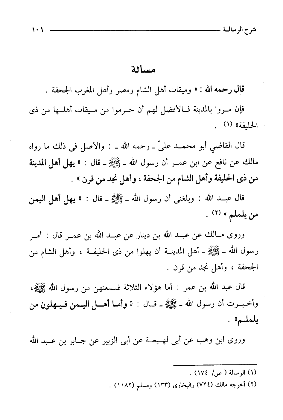 وروى مالك عن عبد الله بن دينار عن عبد الله بن عمر قال: أمر رسول الله - صلى الله عليه وسلم - أهل المدينة أن يهلوا من ذى الحليفة، وأهل الشام من الجحفة، وأهل نجد من قرن.