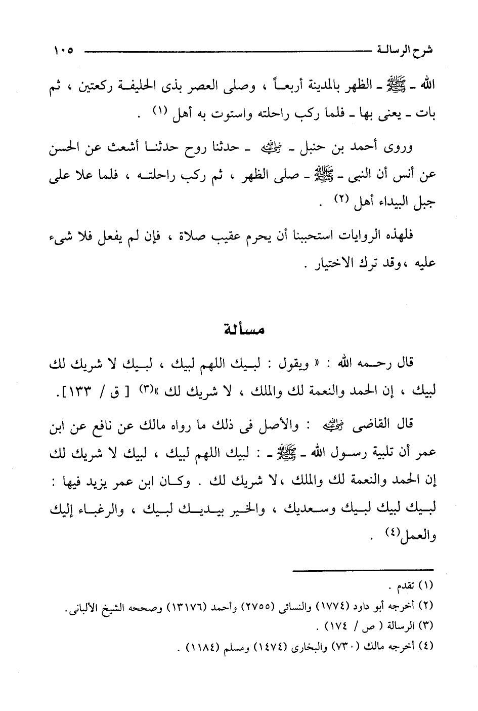 الله - صلى الله عليه وسلم - الظهر بالمدينة أربعًا، وصلى العصر بذي الحليفة ركعتين، ثم بات - يعني بها - فلما ركب راحلته واستوت به أهل.