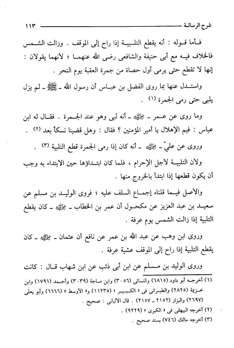 واستدل عنها بما روى الفضل بن عباس أن رسول الله - صلى الله عليه وسلم - لم يزل يلبي حتى رمى الجمرة.
