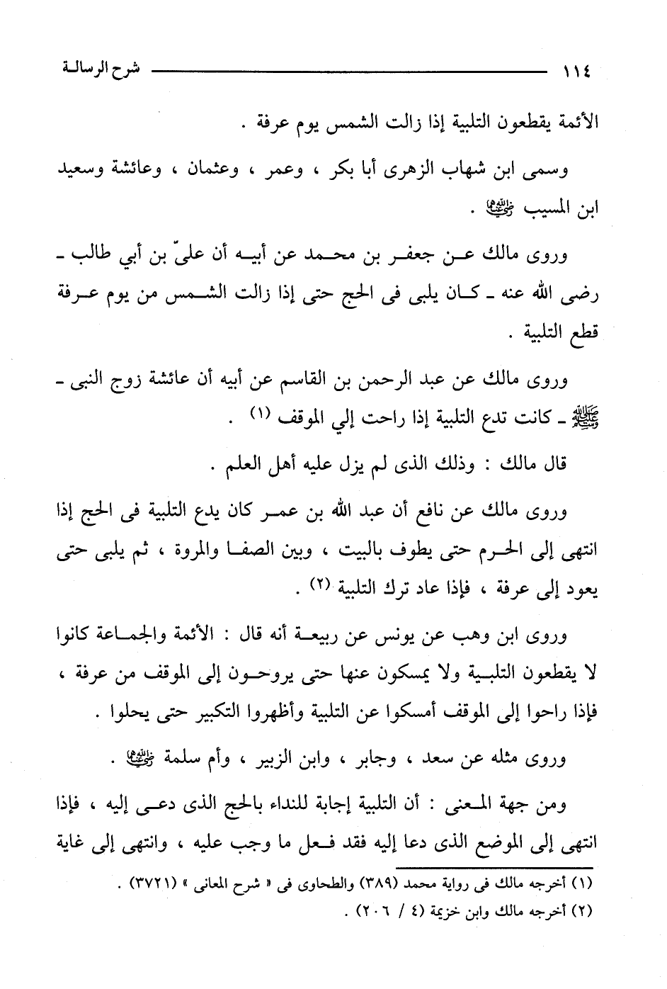 وروى ابن وهب عن يونس عن ربيعة أنه قال: الأئمة والجماعة كانوا لا يقطعون التلبية ولا يمسكون عنها حتى يروحون إلى الموقف من عرفة، فإذا راحوا إلى الموقف أمسكوا عن التلبية وأظهروا التكبير حتى يحلوا.
