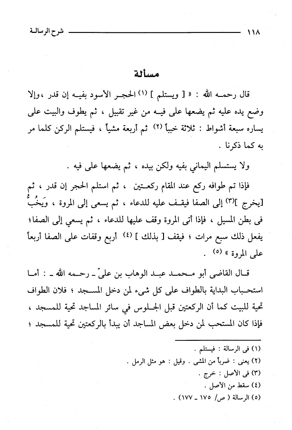فإذا تم طوافه ركع عند المقام ركعتين، ثم استلم الحجر إن قدر، ثم [يخرج] إلى الصفا فيقف عليه للدعاء، ثم يسعى إلى المروة، ويخب في بطن المسيل، فإذا أتى المروة وقف عليها للدعاء، ثم يسعي إلى الصفا؛ يفعل ذلك سبع مرات؛ فيقف [بذلك] أربع وقفات على الصفا أربعًا على المروة".