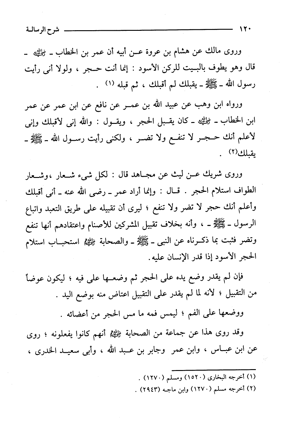 وروى مالك عن هشام بن عروة عن أبيه أن عمر بن الخطاب - رضي الله عنه - قال وهو يطوف بالبيت للركن الأسود: إنما أنت حجر، ولولا أني رأيت رسول الله - صلى الله عليه وسلم - يقبلك لم أقبلك، ثم قبله.