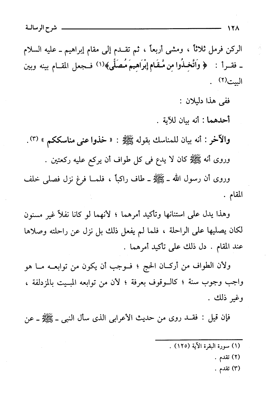 الركن فرمل ثلاثًا، ومشى أربعًا، ثم تقدم إلى مقام إبراهيم - عليه السلام - فقرأ:} واتخذوا من مقام إبراهيم مصلى {فجعل المقام بينه وبين البيت.