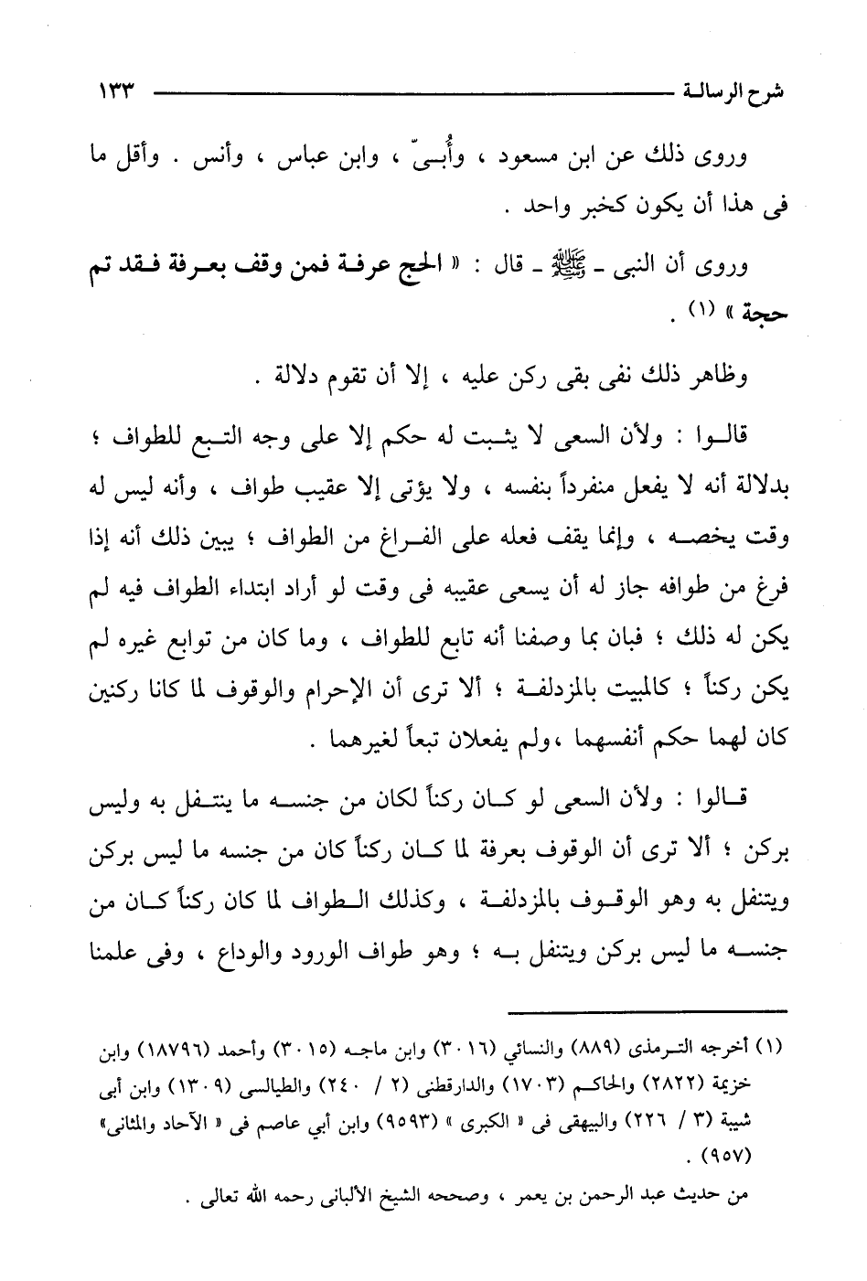 وروى أن النبي - صلى الله عليه وسلم - قال: "الحج عرفة فمن وقف بعرفة فقد تم حجة".