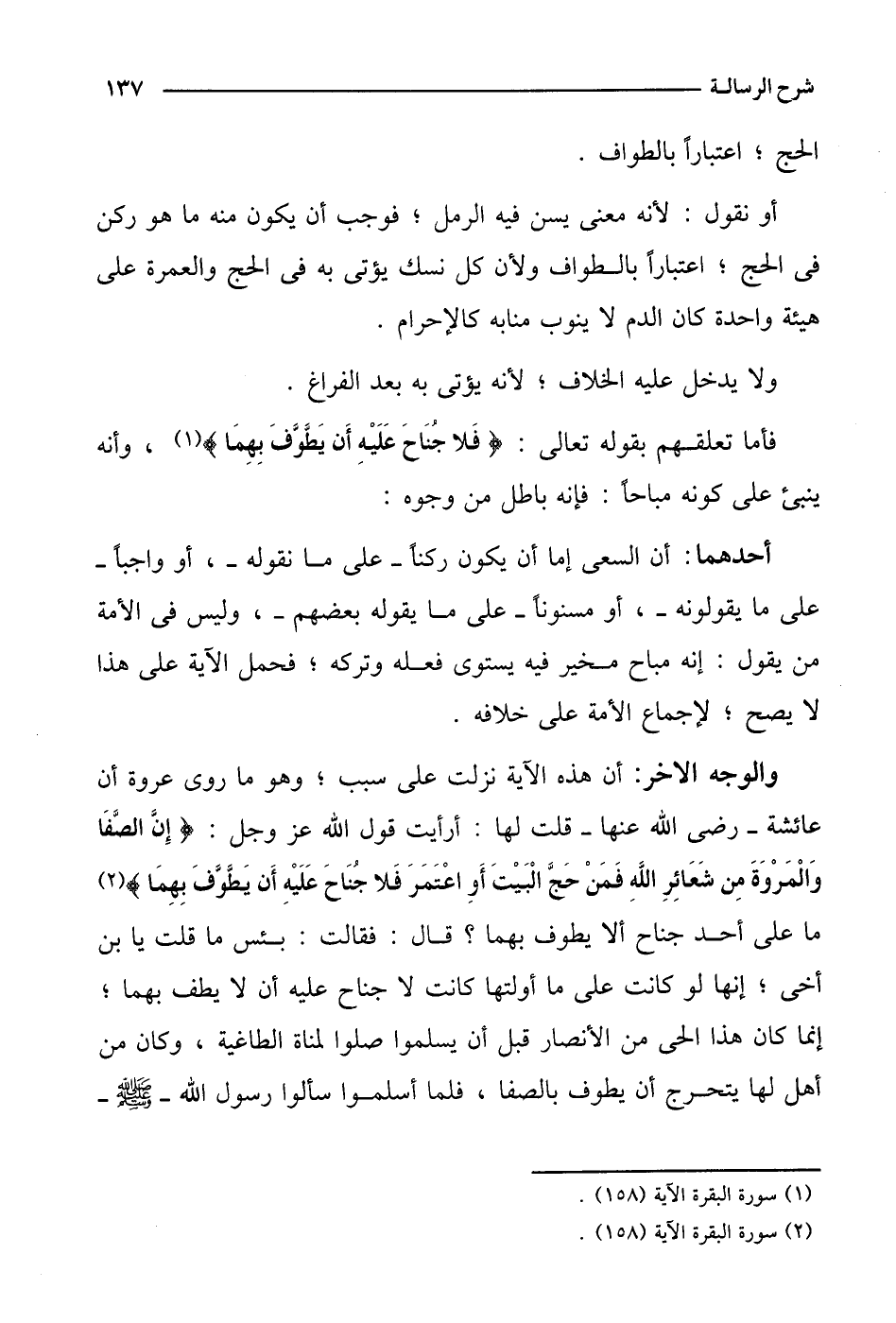 أحدهما: أن السعي إما أن يكون ركنًا - على ما نقوله -، أو واجبًا - على ما يقولونه -، أو مسنونًا - على ما يقوله بعضهم -، وليس في الأمة من يقول: إنه مباح مخير فيه يستوي فعله وتركه؛ فحمل الآية على هذا لا يصح؛ لإجماع الأمة على خلافه.