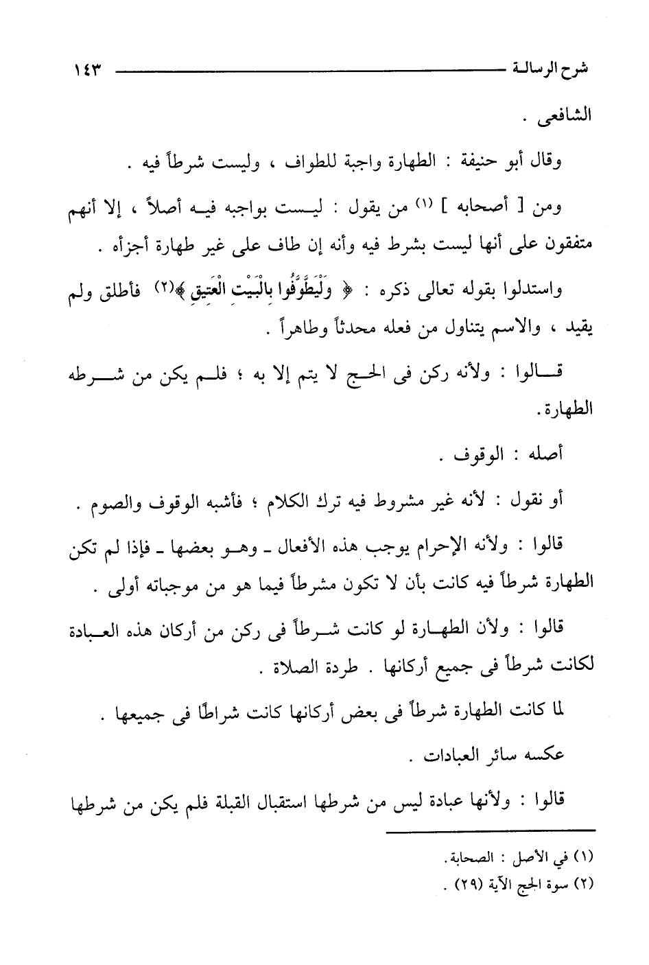 قالوا: ولأنه الإحرام يوجب هذه الأفعال - وهو بعضها - فإذا لم تكن الطهارة شرطًا فيه كانت بأن لا تكون مشرطًا فيما هو من موجباته أولى.