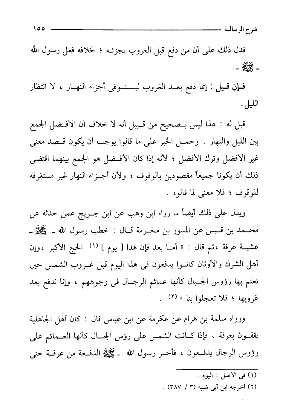 ويدل على ذلك أيضًا ما رواه ابن وهب عن ابن جريج عمن حدثه من محمد بن قيس عن المسور بن مخرمة قال: خطب رسول الله- صلى الله عليه وسلم- عشية عرفة، ثم قال: "أما بعد فإن هذا [يوم] الحج الأكبر، وإن أهل الشرك والأوثان كانوا يدفعون في هذا اليوم قبل غروب الشمس حين تعتم بها رؤوس الجبال كأنها عمائم الرجال في وجوههم، وإنا ندفع بعد غروبها؛ فلا تعجلوا بنا".