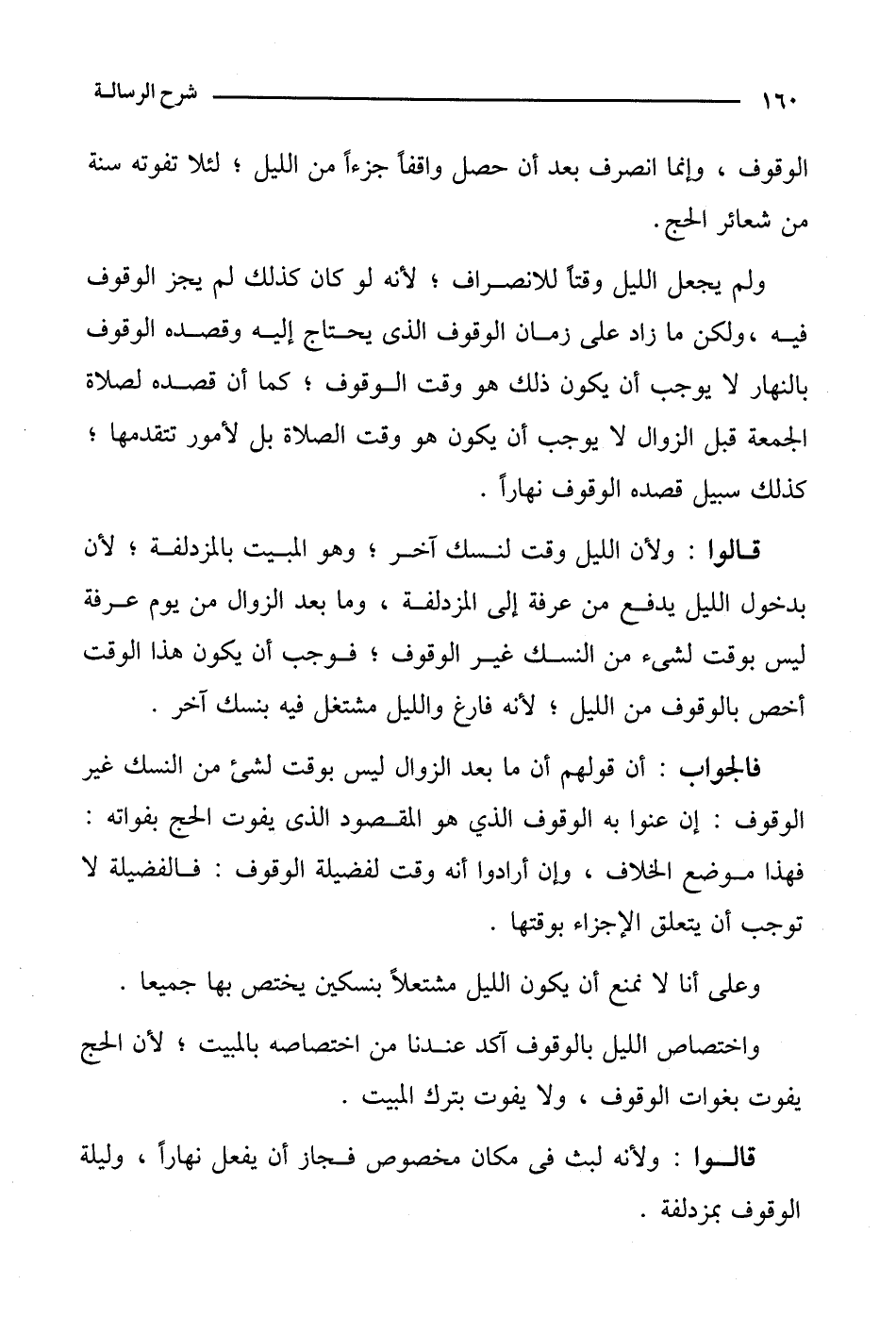 قالوا: ولأن الليل وقت لنسك آخر؛ وهو المبيت بالمزدلفة؛ لأن بدخول الليل يدفع من عرفة إلى المزدلفة، وما بعد الزوال من يوم عرفة ليس بوقت لشيء من النسك غير الوقوف؛ فوجب أن يكون هذا الوقت أخص بالوقوف من الليل؛ لأنه فارغ والليل مشتغل فيه بنسك آخر.