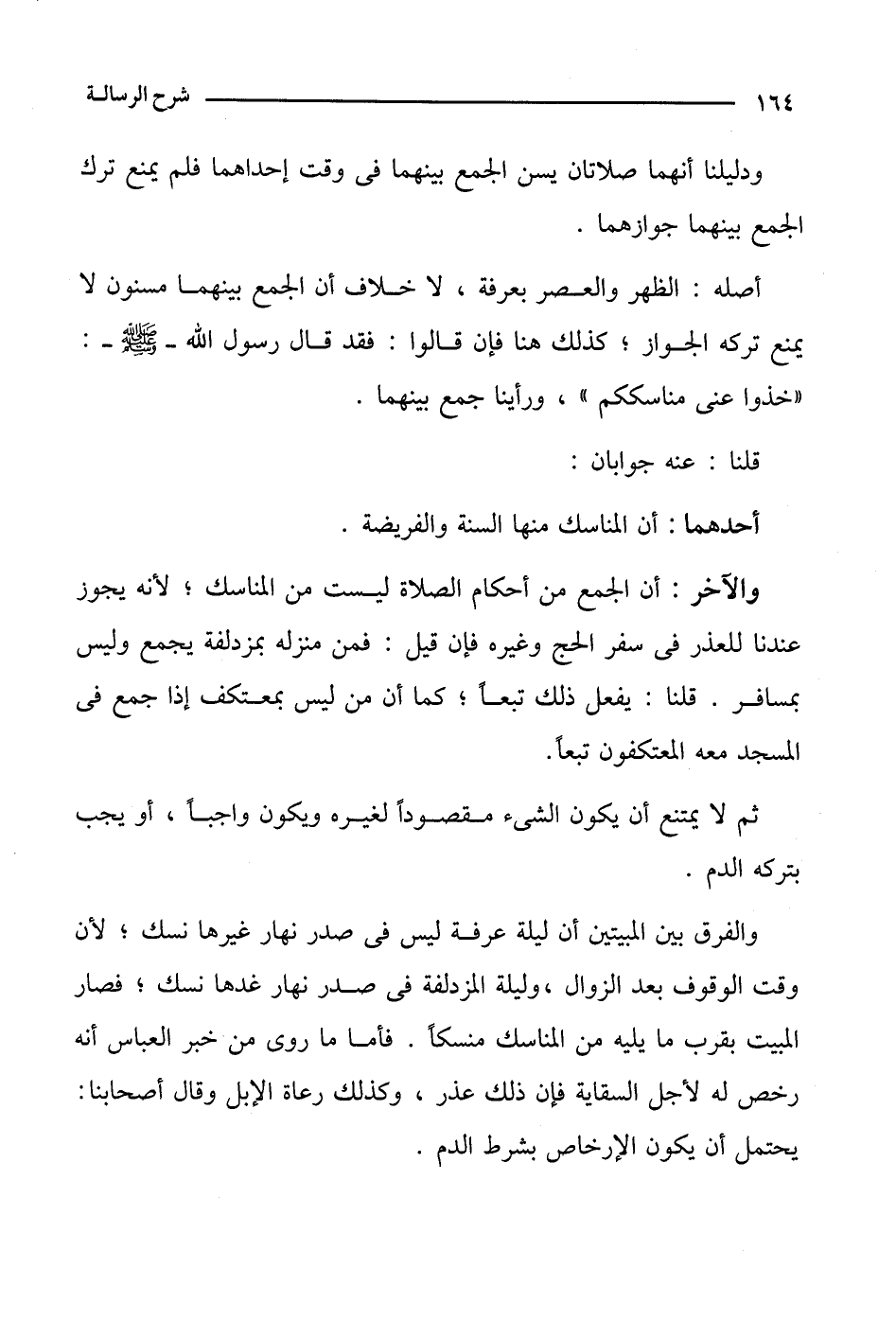 والآخر: أن الجمع من أحكام الصلاة ليست من المناسك؛ لأنه يجوز عندنا للعذر في سفر الحج وغيره فإن قيل: فمن منزلة بمزدلفة يجمع وليس بمسافر. قلنا: يفعل ذلك تبعًا؛ كما أن من ليس بمعتكف إذ جمع في المسجد معه المعتكفون تبعًا.