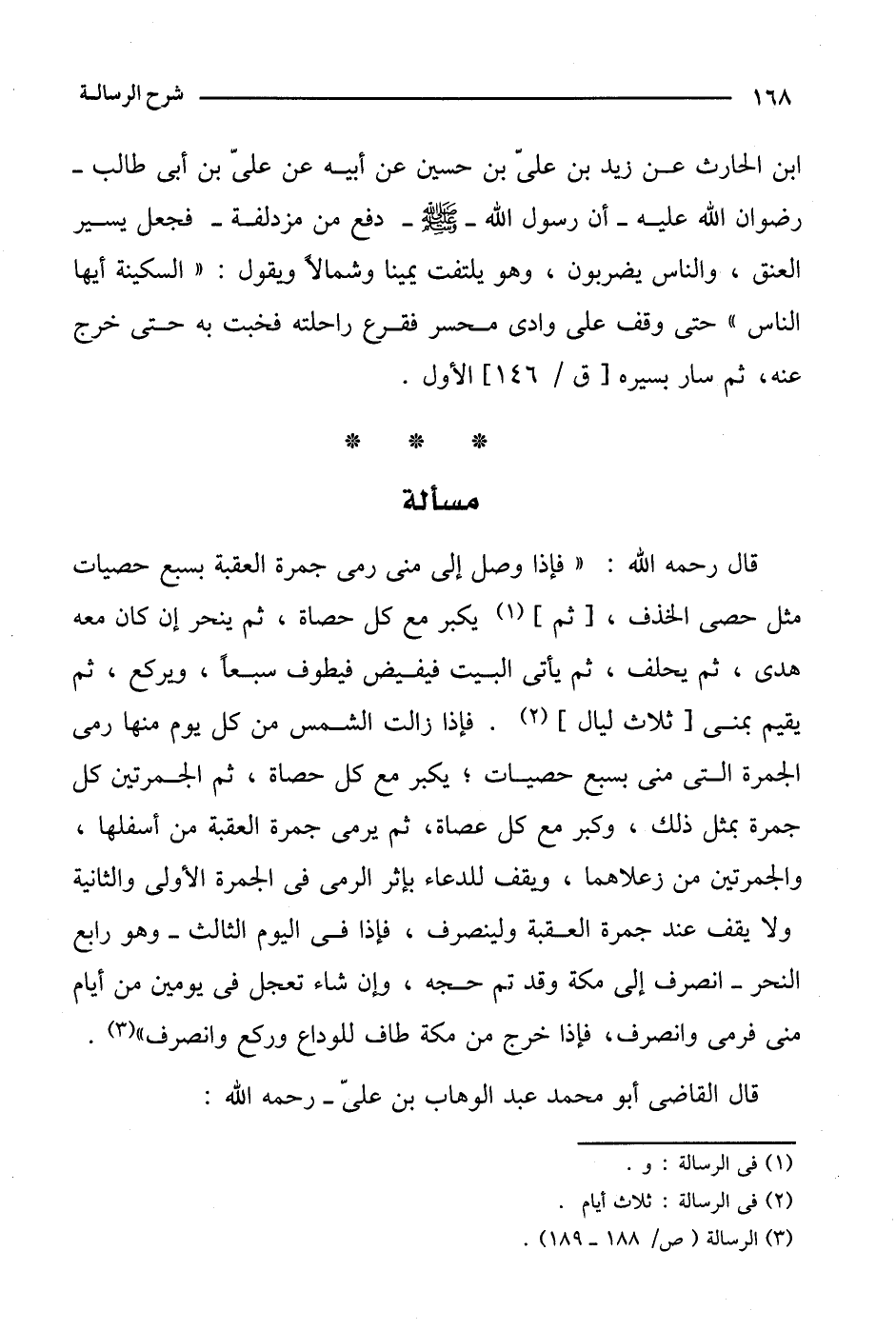 قال رحمه الله: "فإذا وصل إلى منى رمى جمرة العقبة بسبع حصيات مثل حصى الخذف، [ثم] يكبر مع كل حصاة، ثم ينحر إن كان معه هدى، ثم يحلف، ثم يأتي البيت فيفيض فيطوف سبعًا، ويركع ثم يقيم بمنى [ثلاث ليال]. فإذا زالت الشمس من كل يوم منها رمى الجمرة التي منى بسبع حصيات؛ يكبر مع كل حصاة، ثم الجمرتين كل جمرة بمثل ذلك، وكبر مع كل عصاة، ثم يرمي الجمرة العقبة من أسفلها، والجمرتين من زعلاهما، ويقف للدعاء بإثر الرمي في الجمرة الأولى والثانية ولا يقف عند جمرة لعقبة ولينصرف، فإذا في اليوم الثالث- وهو رابع النحر- انصرف إلى مكة وقد تم حجه، وإن شاء تعجل في يومين من أيام منى فرمى وانصرف، فإذا خرج من مكة طاف للوداع وركع وانصرف".