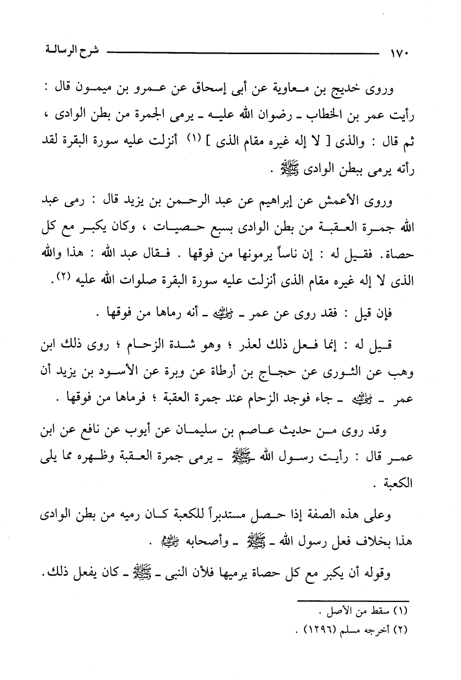 وروى الأعمش عن إبراهيم عن عبد الرحمن بن يزيد قال: رمى عبد الله جمرة العقبة من بطن الوادي بسبع حصيات، وكان يكبر مع كل حصاة. فقيل له: إن ناسًا يرمونها من فوقها. فقال عبد الله: هذا والله الذي لا إله غيره مقام الذي أنزلت عليه سورة البقرة صلوات الله عليه.