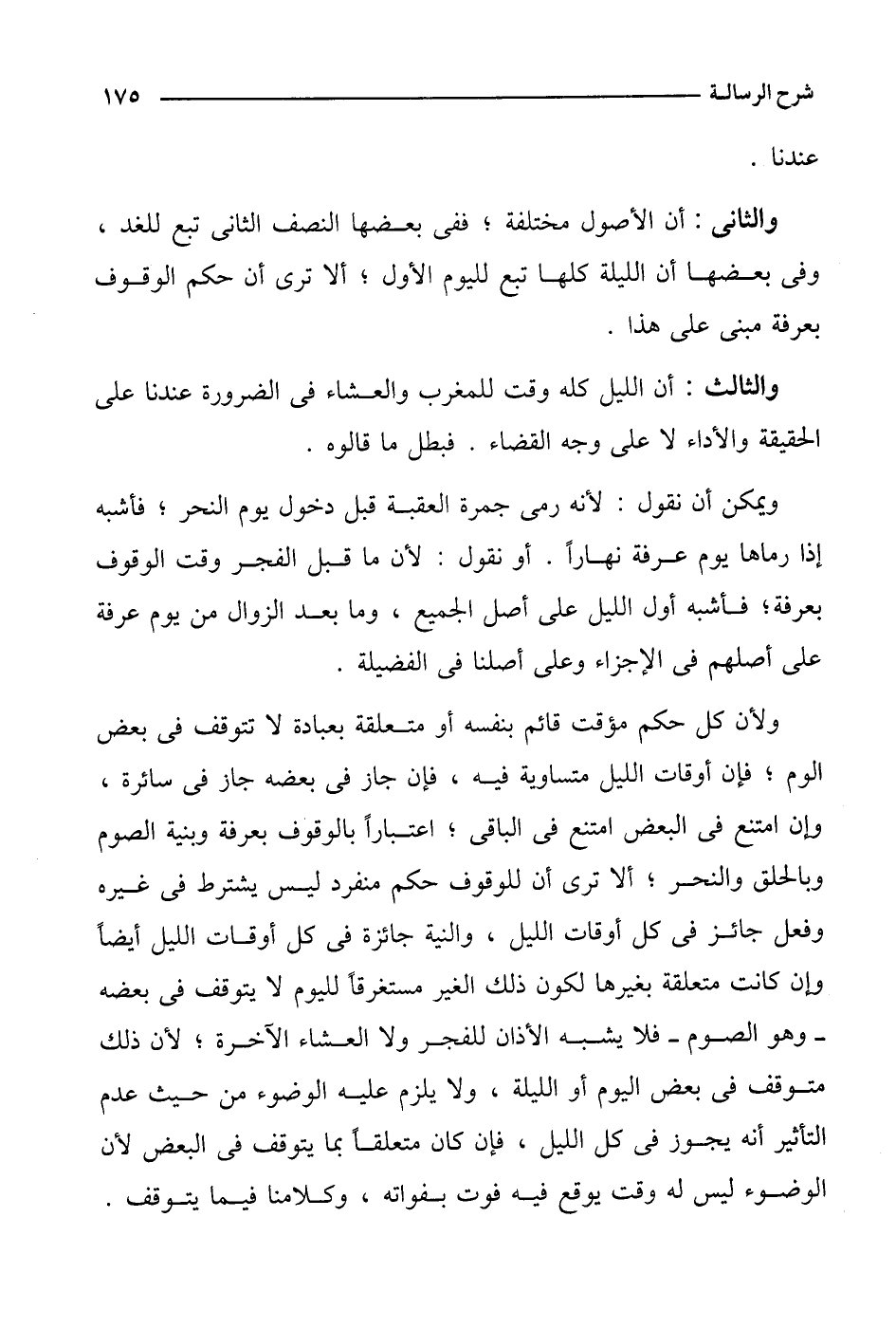 ولأن كل حكم مؤقت قائم بنفسه أو متعلقة بعبادة لا تتوقف في بعض الوم؛ فإن أوقات الليل متساوية فيه، فإن جاز في بعضه جاز في سائره، وإن امتنع في البعض امتنع في الباقي؛ اعتبارًا بالوقوف بعرفة وبنية الصوم وبالحلق والنحر؛ ألا ترى أن للوقوف حكم منفرد ليس يشترط في غيره وفعل جائز في كل أوقات الليل، والنية جائزة في كل أوقات الليل أيضًا وإن كانت متعلقة بغيرها لكون ذلك الغير مستغرقًا لليوم لا يتوقف في بعضه- وهو الصوم- فلا يشبه الأذان للفجر ولا العشاء الآخرة؛ لأن ذلك متوقف في بعض اليوم أو الليلة، ولا يلزم عليه لوضوء من حيث عدم التأثير أنه يجوز في كل الليل، فإن كان متعلقًا بما يتوقف في البعض لأن الوضوء ليس له وقت يوقع فيه فوت بفواته، وكلامنا فيما يتوقف.