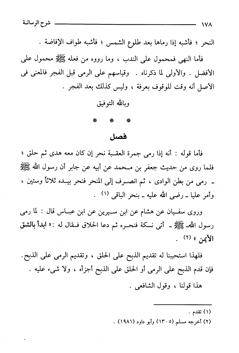 فأما قوله: أنه إذا رمى جمرة العقبة نحر إن كان معه هدى ثم حلق؛ فلما روى من حديث جعفر بن محمد عن أبيه عن جابر أن رسول الله صلى الله عليه وسلم- رمى من بطن الوادي، ثم انصرف إلى المنحر فنحر بيده ثلاثًا وستين، وأمر عليًا- رضي الله عليه- بنحر الباقي.