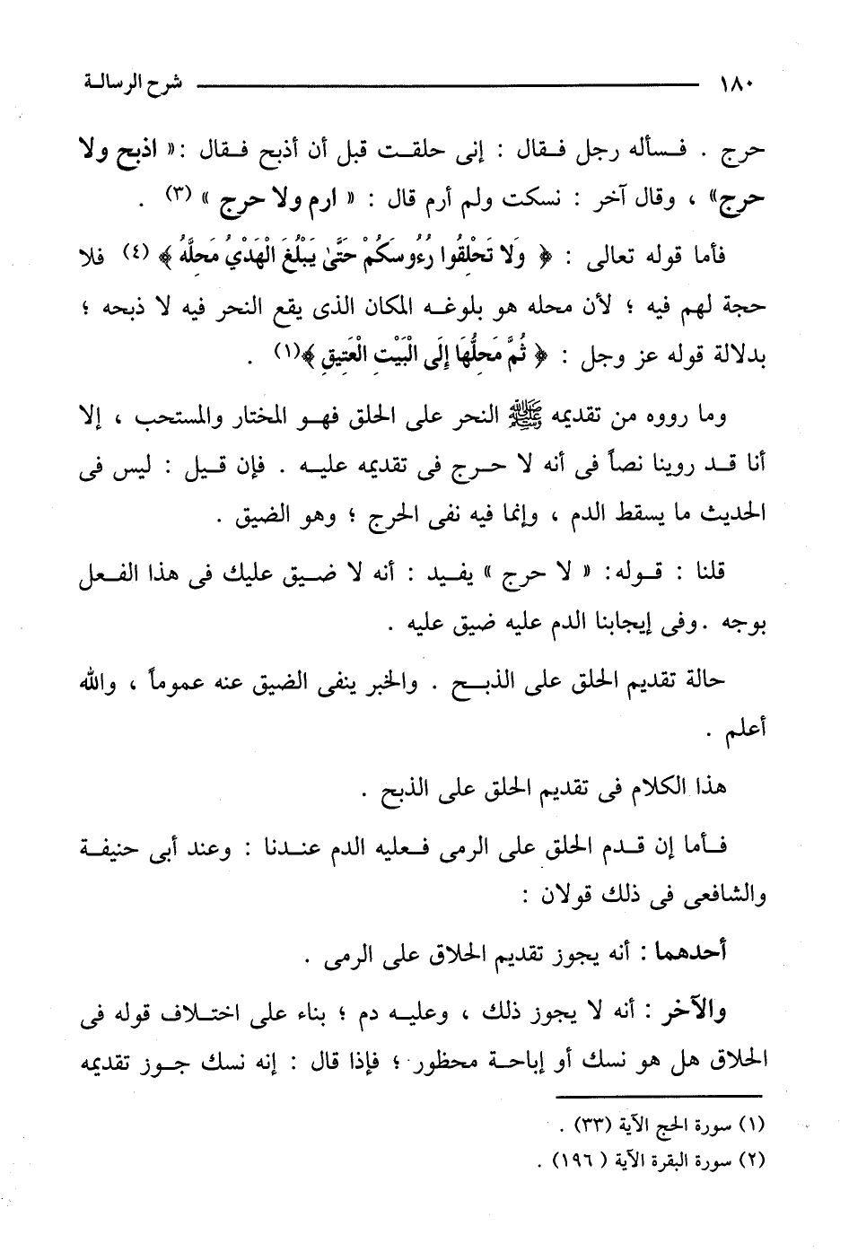 وما رووه من تقديمه صلى الله عليه وسلم النحر على الحلق فهو المختار والمستحب، إلا أنا قد روينا نصًا في أنه لا حرج في تقديمه عليه. فإن قيل: ليس في الحديث ما يسقط الدم، وغنما فيه نفي الحرج؛ وهو الضيق.