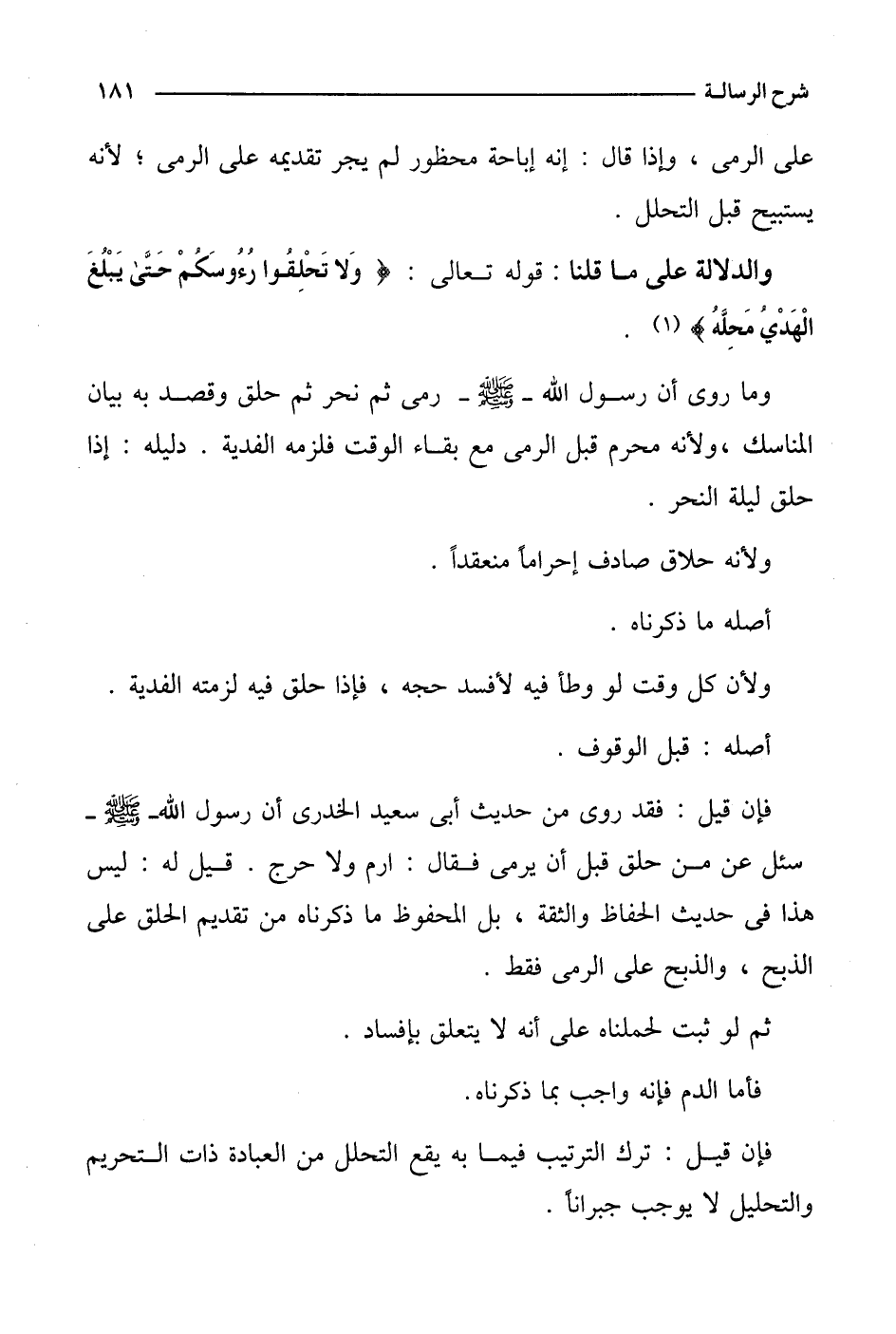 وما روي أن رسول الله- صلى الله عليه وسلم- رمى ثم نحر ثم حلق وقصد به بيان المناسك، ولأنه محرم قبل الرمي مع بقاء الوقت فلزمه الفدية. دليله: إذا حلق ليلة النحر.