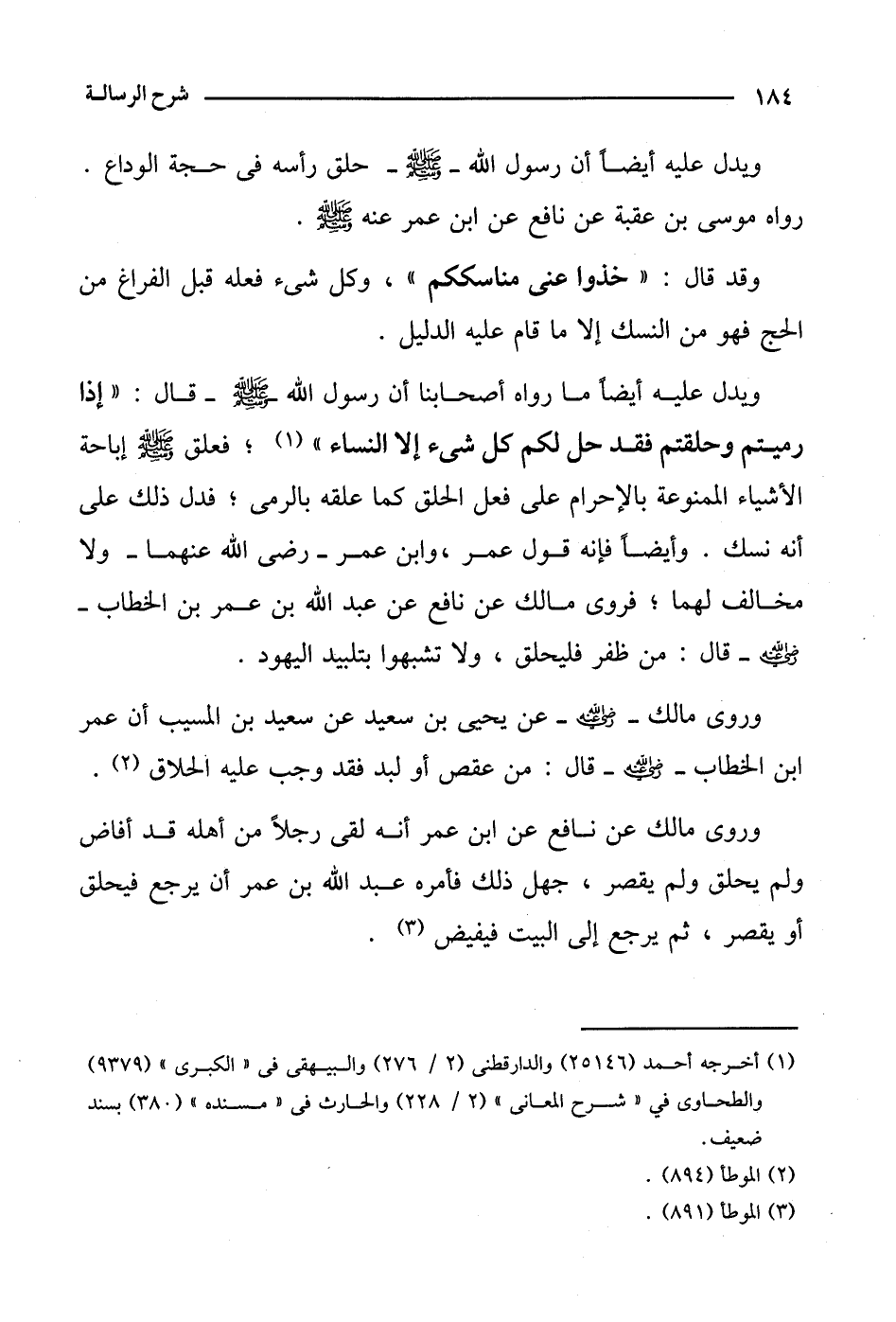 ويدل عليه أيضًا أن رسول الله- صلى الله عليه وسلم- حلق رأسه في حجة الوداع. رواه موسى بن عقبة عن نافع عن ابن عمر عنه صلى الله عليه وسلم.