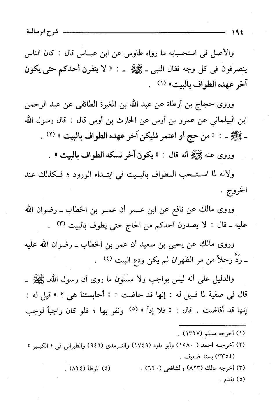وروي عنه صلى الله عليه وسلم أنه قال: "يكون آخر نسكه الطواف بالبيت".