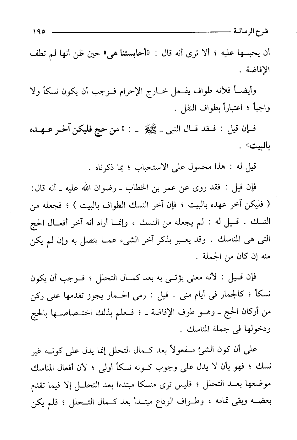 فإن قيل: فقد روي عن عمر بن الخطاب- رضوان الله عليه- أنه قال: (فليكن آخر عهده بالبيت؛ فإن آخر النسك الطواف بالبيت)؛ فجعله من النسك. قيل له: لم يجعله من النسك، وإنما أراد أنه آخر أفعال الحج التي هي المناسك. وقد يعبر بذكر آخر الشيء عما يتصل به وإن لم يكن منه إن كان من الجملة.