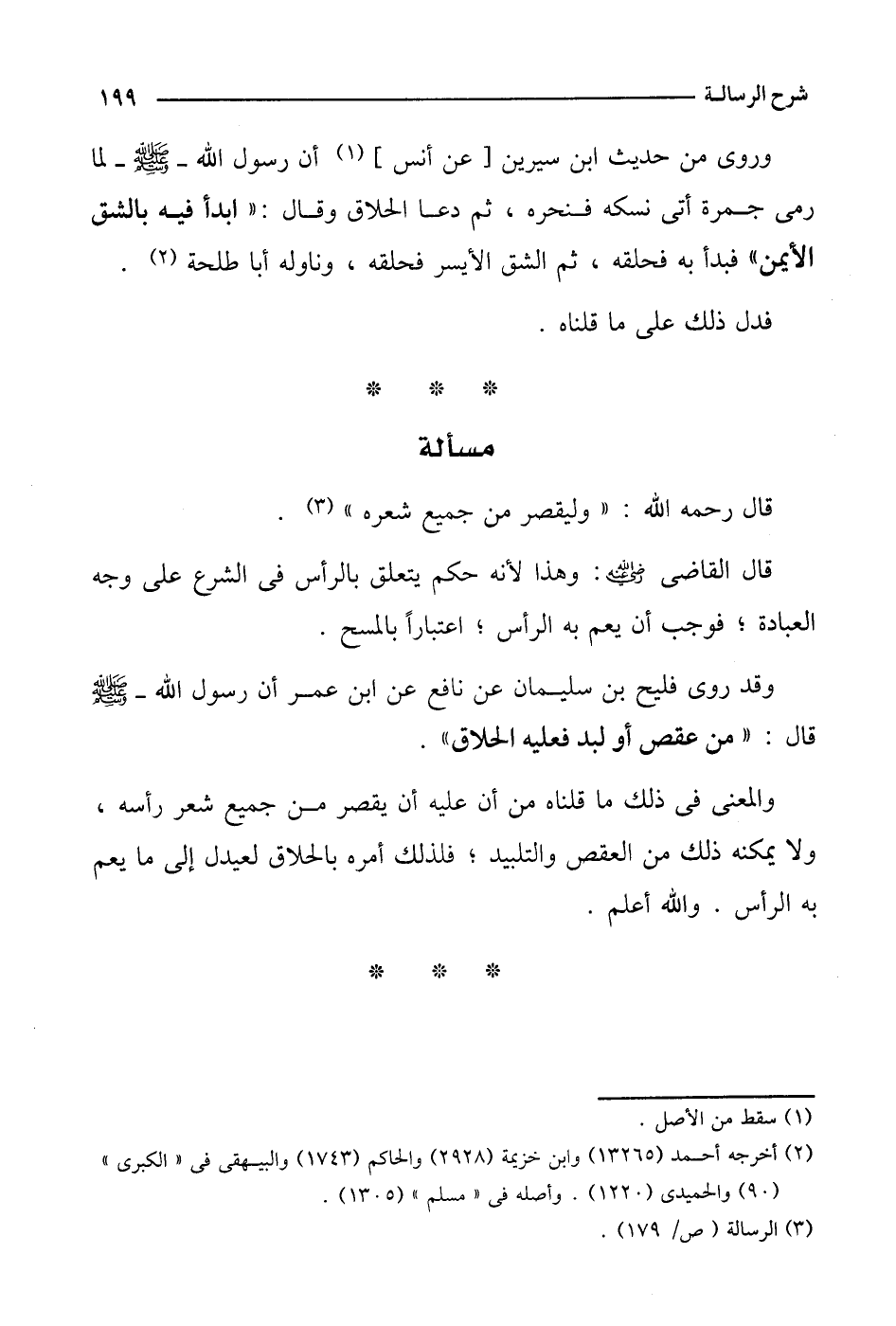 (وروي) من حديث ابن سيرين [عن أنس] أن رسول الله- صلى الله عليه وسلم- لما رمى جمرة أتى نسكه فنحره، ثم دعا الحلاق وقال: "ابدأ فيه بالشق الأيمن" فبدأ به فحلقه، ثم الشق الأيسر فحلقه، وناوله أبا طلحة.