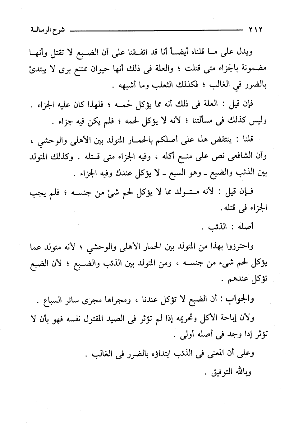 ويدل على ما قلناه أيضًا أنا قد اتفقنا على أن الضبع لا تقتل وأنها مضمونة بالجزاء متى قتلت؛ والعلة في ذلك أنها حيوان ممتنع برى لا يبتدئ بالضرر في الغالب؛ فكذلك الثعلب وما أشبهه.