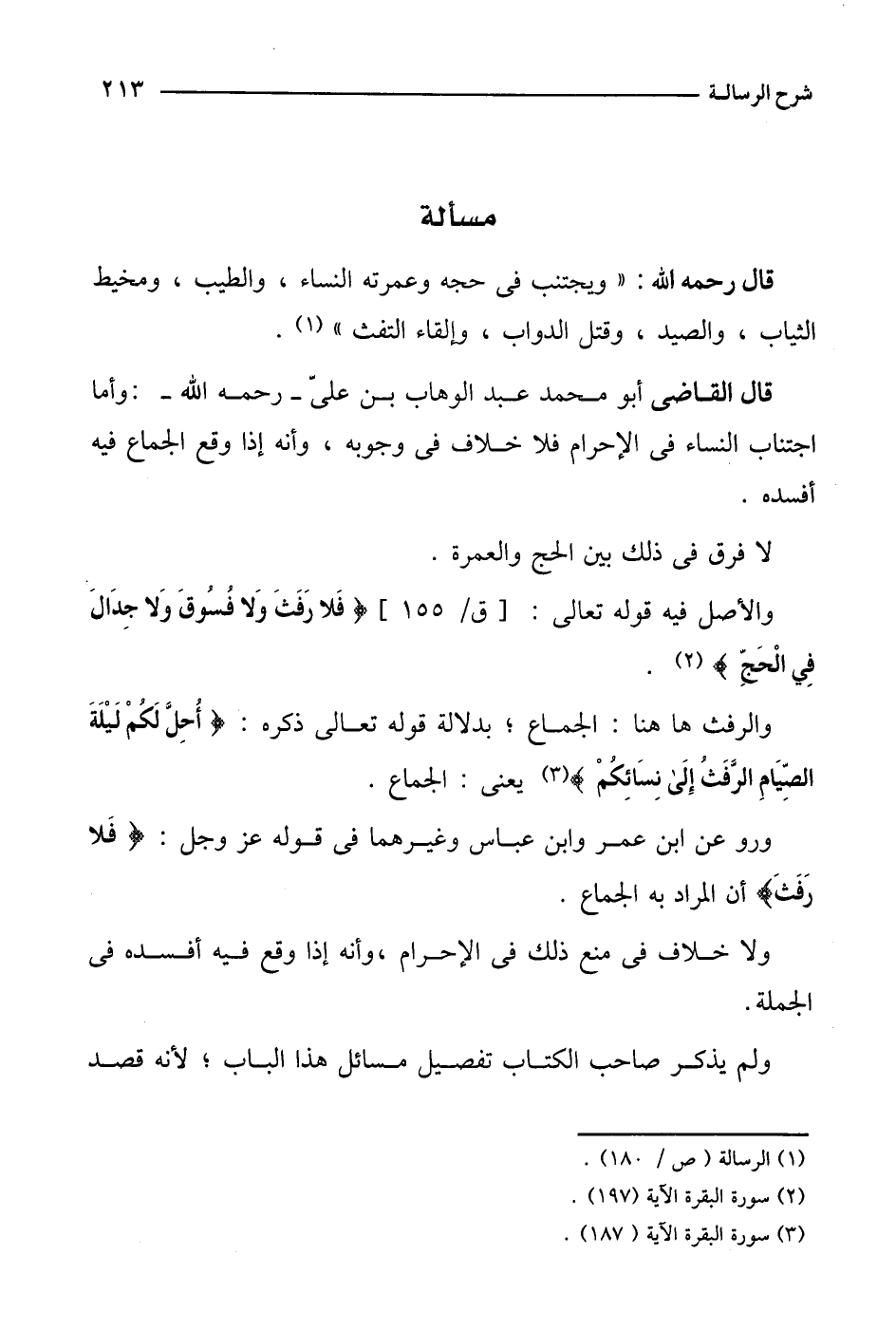 قال رحمه الله: "ويجتنب في حجه وعمرته النساء، والطيب، ومخيط الثياب، والصيد، وقتل الدواب، وإلقاء التفث".