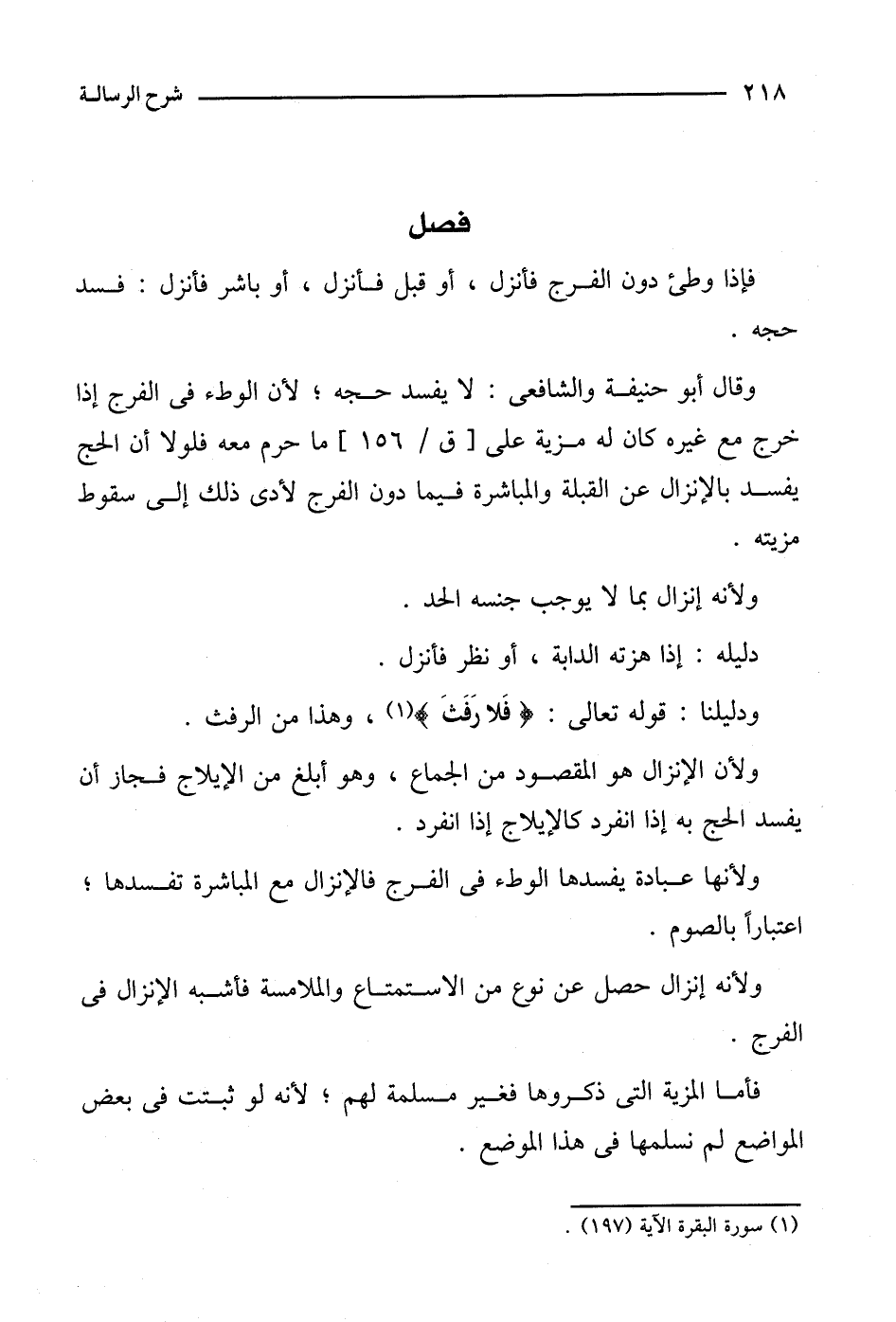 وقال أبو حنيفة والشافعي: لا يفسد حجه؛ لأن الوطء في الفرج إذا خرج مع غيره كان له مزية على [ق/156] ما حرم معه فلولا أن الحج يفسد بالإنزال عن القبلة والمباشرة فيما دون الفرج لأدى ذلك إلى سقوط مزيته.