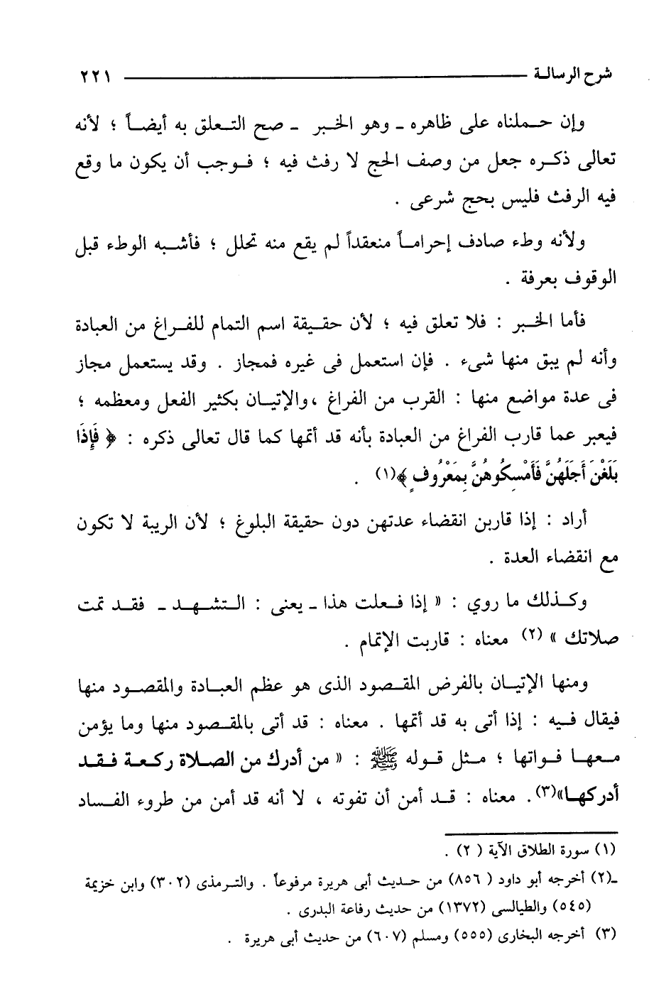 فأما الخبر: فلا تعلق فيه؛ لأن حقيقة اسم التمام للفراغ من العبادة وأنه لم يبق منها شيء. فإن استعمل في غيره فمجاز. وقد يستعمل مجاز في عدة مواضع منها: القرب من الفراغ، والإتيان بكثير الفعل ومعظمه؛ فيعبر عما قارب الفراغ من العبادة بأنه قد أتمها كما قال تعالى ذكره: {فإذا بلغنا أجلهن فأمسكوهن بمعروف}.