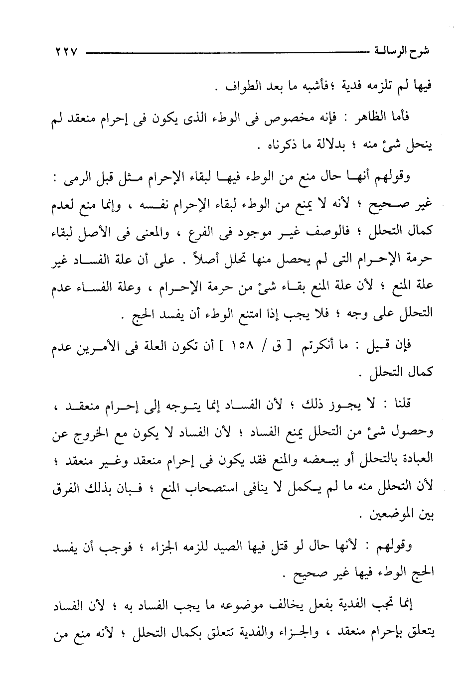 وقولهم أنها حال منع من الوطء فيها لبقاء الإحرام مثل قبل الرمي: غير صحيح؛ لأنه لا يمنع من الوطء لبقاء الإحرام نفسه، وإنما منع لعدم كمال التحلل؛ فالوصف غير موجود في الفرع، والمعنى في الأصل لبقاء حرمة الإحرام التي لم يحصل منها تحلل أصلاً. على أن علة الفساد غير علة المنع؛ لأن علة المنع بقاء شيء من حرمة الإحرام، وعلة الفساد عدم التحلل على وجه؛ فلا يجب إذا امتنع الوطء أن يفسد الحج.