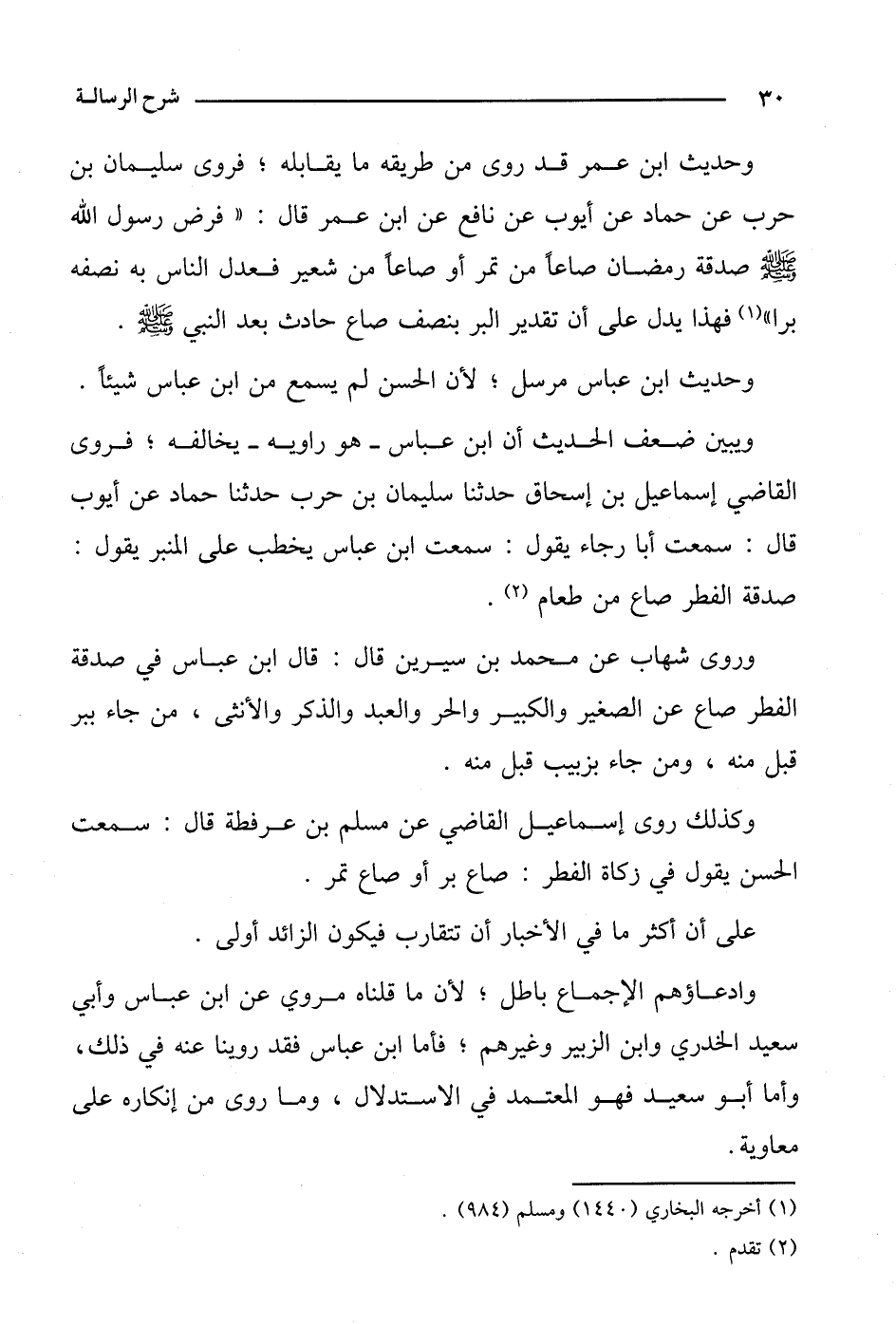 وحديث ابن عمر قد روى من طريقه ما يقابله؛ فروى سليمان بن حرب عن حماد عن أيوب عن نافع عن ابن عمر قال: "فرض رسول الله صلى الله عليه وسلم صدقة رمضان صاعًا من تمر أو صاعًا من شعير فعدل الناس به نصفه برا" فهذا يدل على أن تقدير البر بنصف صاع حادث بعد النبي صلى الله عليه وسلم.