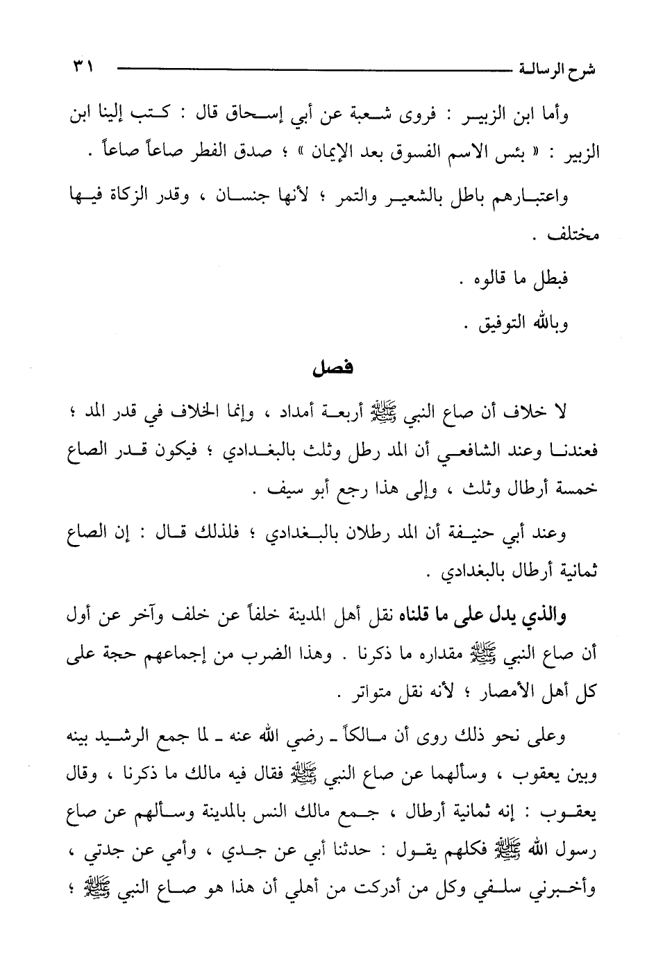وعلى نحو ذلك روى أن مالكًا - رضي الله عنه - لما جمع الرشيد بينه وبين يعقوب، وسألهما عن صاع النبي صلى الله عليه وسلم فقال فيه مالك ما ذكرنا، وقال يعقوب: إنه ثمانية أرطال، جمع مالك النس بالمدينة وسألهم عن صاع رسول الله صلى الله عليه وسلم فكلهم يقول: حدثنا أبى عن جدي، وأمي عن جدتي، وأخبرني سلفي وكل من أدركت من أهلي أن هذا هو صاع النبي صلى الله عليه وسلم؛