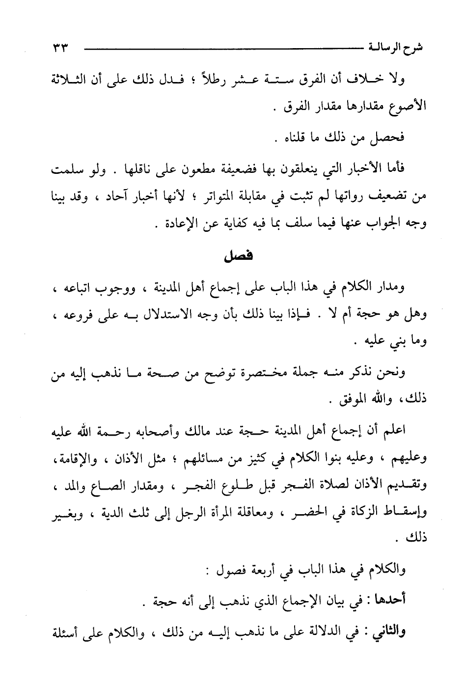 اعلم أن إجماع أهل المدينة حجة عند مالك وأصحابه رحمة الله عليه وعليهم، وعليه بنوا الكلام في كثير من مسائلهم؛ مثل الأذان، والإقامة، وتقديم الأذان لصلاة الفجر قبل طلوع الفجر، ومقدار الصاع والمد، وإسقاط الزكاة في الحضر، ومعاقلة المرأة الرجل إلى ثلث الدية، وبغير ذلك.
