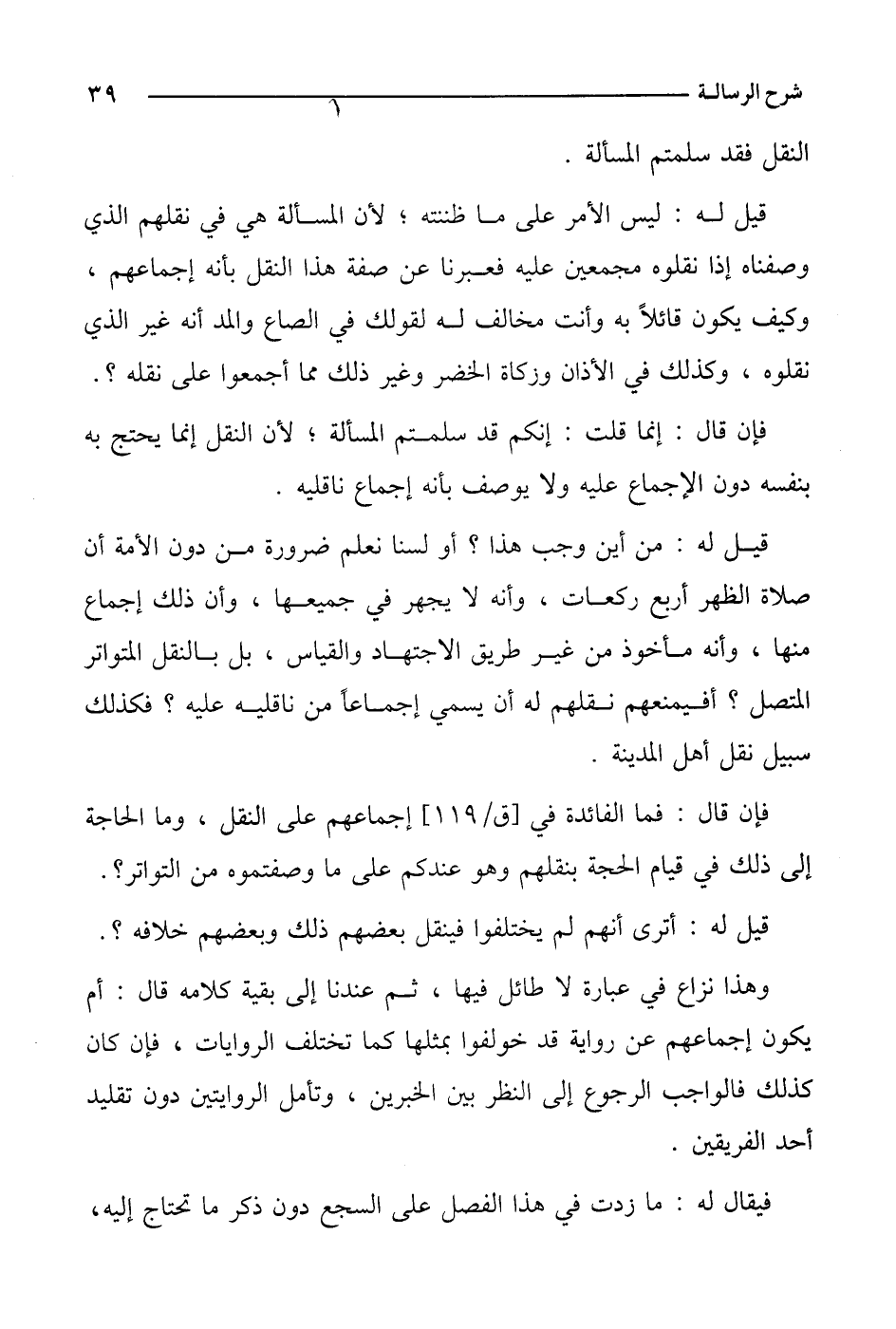 قيل له: ليس الأمر على ما ظننته؛ لأن المسألة هي في نقلهم الذي وصفناه إذا نقلوه مجمعين عليه فعبرنا عن صفة هذا النقل بأنه إجماعهم، وكيف يكون قائلاً به وأنت مخالف له لقولك في الصاع والمد أنه غير الذي نقلوه، وكذلك في الأذان وزكاة الخضر وغير ذلك مما أجمعوا على نقله؟.