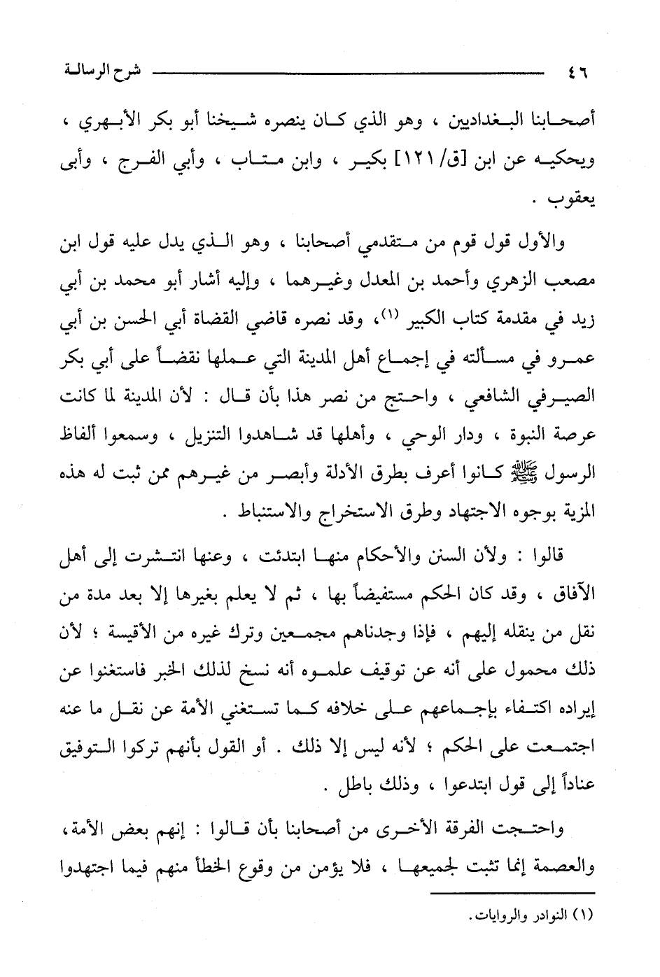 والأول قول قوم من متقدمي أصحابنا، وهو الذي يدل عليه قول ابن مصعب الزهري وأحمد بن المعدل وغيرهما، وإليه أشار أبو محمد بن أبي زيد في مقدمة كتاب الكبير، وقد نصره قاضي القضاة أبي الحسن بن أبي عمرو في مسألته في إجماع أهل المدينة التي عملها نقضًا على أبي بكر الصيرفي الشافعي، واحتج من نصر هذا بأن قال: لأن المدينة لما كانت عرصة النبوة، ودار الوحين وأهلها قد شاهدوا التنزيل، وسمعوا ألفاظ الرسول صلى الله عليه وسلم كانوا أعرف بطرق الأدلة وأبصر من غيرهم ممن ثبت له هذه المزية بوجوه الاجتهاد وطرق الاستخراج والاستنباط.