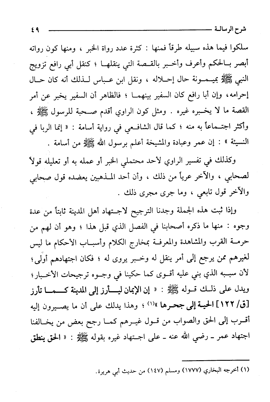 وإذا ثبت هذه الجملة وجدنا الترجيح لاجتهاد أهل المدينة ثابتًا من عدة وجوه: منها ما ذكره أصحابنا في الفصل الذي قبل هذا؛ وهو أن لهم من حرمة القرب والمشاهدة والمعرفة بمخارج الكلام وأسباب الأحكام ما ليس لغيرهم ممن يرجع إلى أمر ينقل له وخبر يروى له؛ فكان اجتهادهم أولى؛ لأن سببه الذي بني عليه أقوى كما حكينا في وجوه ترجيحات الأخبار؛ ويدل على ذلك قوله صلى الله عليه وسلم: "إن الإيمان ليأرز إلى المدينة كما تأرز [ق/ 122] الحية إلى جحرها"؛ وهذا يدلك على أن ما يصيرون إليه أقرب إلى الحق والصواب من قول غيرهم كما رجح بعض من يخالفنا اجتهاد عمر - رضي الله عنه - على اجتهاد غيره بقوله صلى الله عليه وسلم: "الحق ينطق