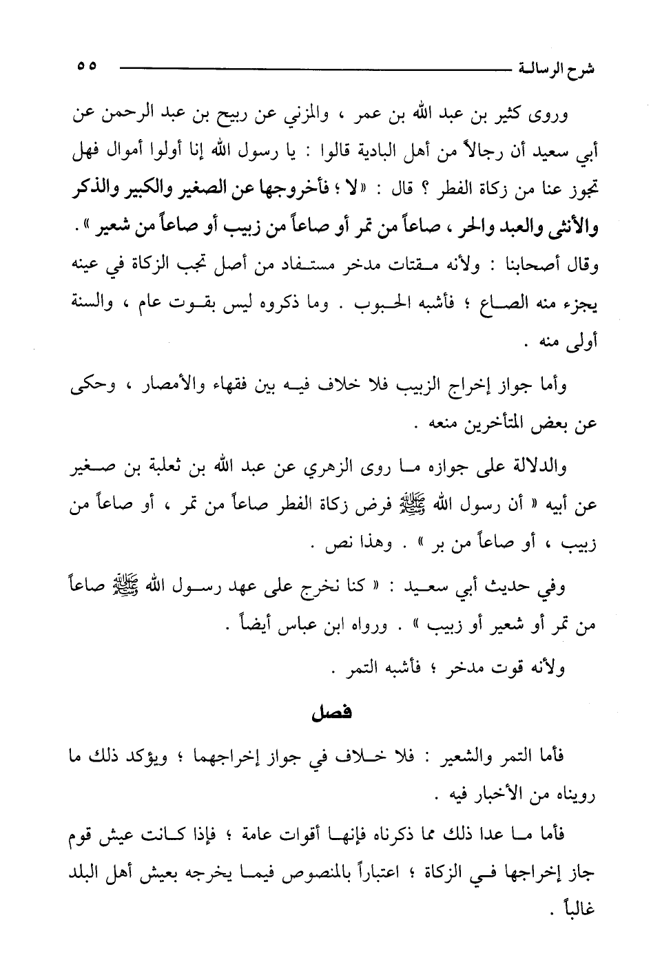 وروى كثير بن عبد الله بن عمر، والمزني عن ربيح بن عبد الرحمن عن أبي سعيد أن رجالاً من أهل البادية قالوا: يا رسول الله إنا أولوا أموال فهل تجوز عنا من زكاة الفطر؟ قال: لا؛ فأخروجها عن الصغير والكبير والذكر والأنثى والعبد والحر، صاعًا من تمر أو صاعًا من زبيب أو صاعًا من شعير".