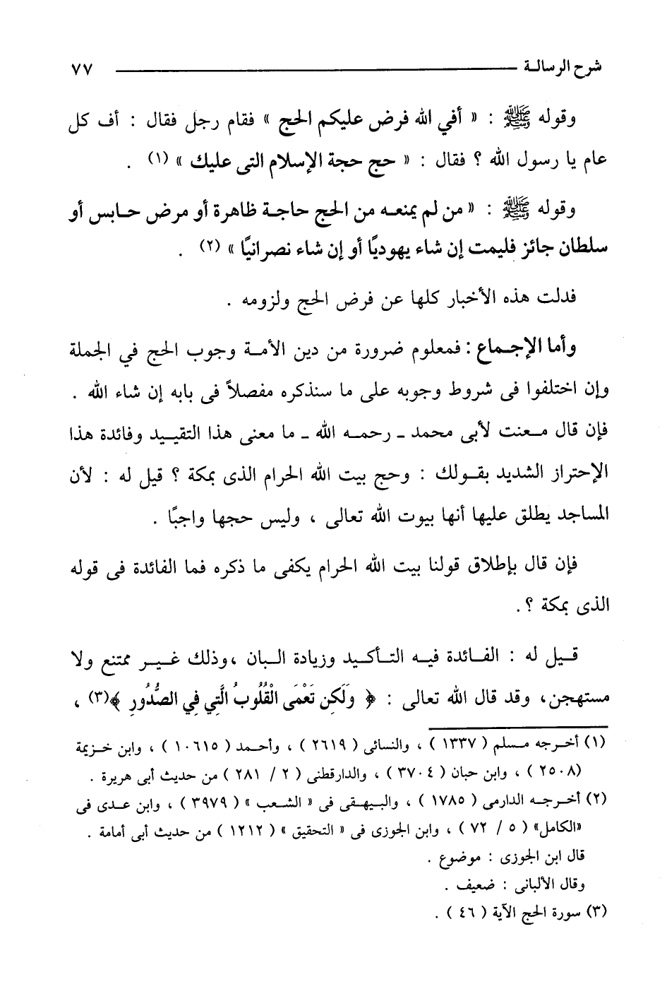 وأما الإجماع: فمعلوم ضرورة من دين الأمة وجوب الحج في الجملة وإن اختلفوا في شروط وجوبه على ما سنذكره مفصلاً في بابه إن شاء الله. فإن قال معنت لأبى محمد - رحمه الله - ما معنى هذا التقييد وفائدة هذا الإحتراز الشديد بقولك: وحج بيت الله الحرام الذي بمكة؟ قيل له: لأن المساجد يطلق عليها أنها بيوت الله تعالى، وليس حجها واجبًا.