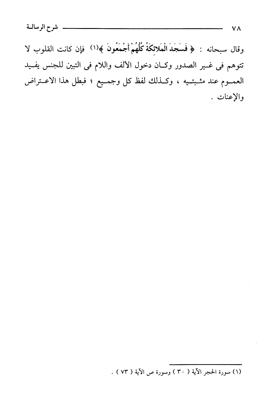 وقال سبحانه:} فسجد الملائكة كلهم أجمعون {فإن كانت القلوب لا تتوهم في غير الصدور وكان دخول الألف واللام في التبين للجنس يفيد العموم عند مثبتيه، وكذلك لفظ كل وجميع؛ فبطل هذا الاعتراض والإعنات.